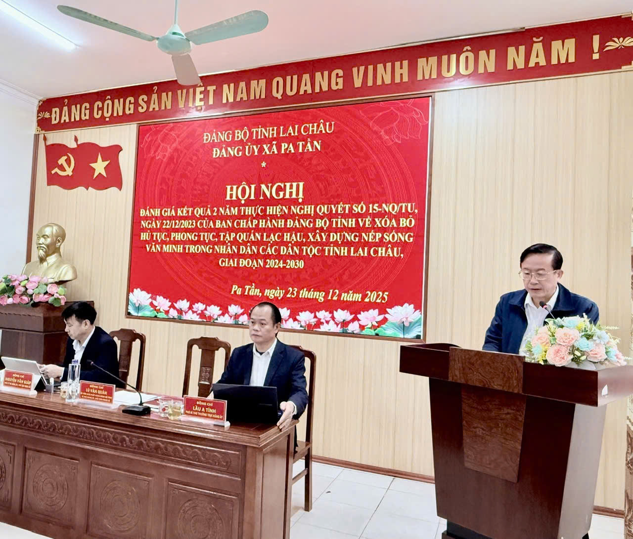 Ngày 23/12, Đảng ủy xã Pa Tần tổ chức Hội nghị đánh giá kết quả 2 năm thực hiện Nghị quyết số 15-NQ/TU, ngày 22/12/2023 của Ban Chấp hành Đảng bộ tỉnh Lai Châu về xóa bỏ hủ tục, phong tục, tập quán lạc hậu, xây dựng nếp sống văn minh trong nhân dân các dân tộc tỉnh Lai Châu, giai đoạn 2024-2030 (Nghị quyết số 15-NQ/TU).