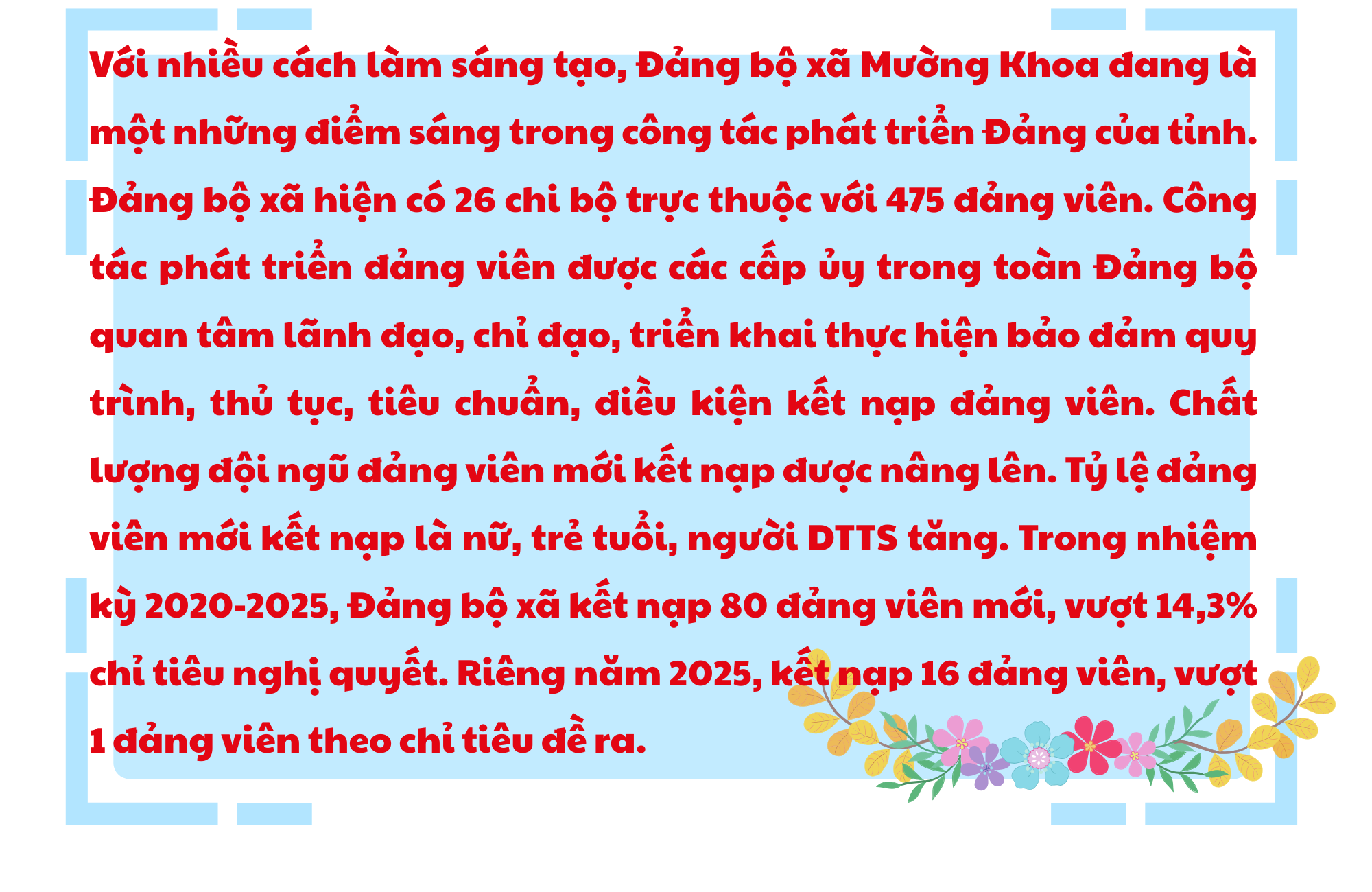 Tại xã Khoen On, nơi có 98% đồng bào DTTS sinh sống, Đảng bộ xã xác định phát triển đảng viên là nhiệm vụ chiến lược trong xây dựng Đảng. Bởi, góp phần quan trọng củng cố hệ thống chính trị cơ sở, tăng cường sự lãnh đạo, bảo đảm tính kế thừa của tổ chức Đảng.