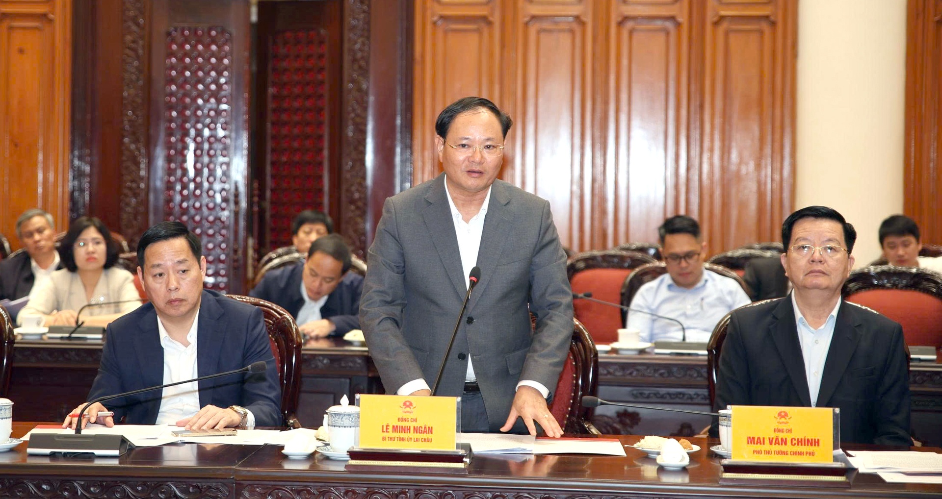 Thay mặt Thường trực Tỉnh uỷ Lai Châu, đồng chí Lê Minh Ngân - Bí thư Tỉnh uỷ đã nêu những kiến nghị, đề xuất của tỉnh Lai Châu liên quan đến: Chủ trương đầu tư cao tốc Bảo Hà – Lai Châu (CT.13) trong giai đoạn 2026-2030; quan tâm bố trí vốn cho tỉnh xây dựng trường phổ thông nội trú liên cấp, đầu tư hạ tầng y tế; sớm phê duyệt quy hoạch và có cơ chế thu hút đầu tư Cảng hàng không Lai Châu; bố trí vốn đầu tư công trung hạn giai đoạn 2026-2030 cho tỉnh để thực hiện công tác bố trí, sắp xếp và ổn định dân cư; tiếp tục quan tâm tìm kiếm đối tác, nhà đầu tư có năng lực để sớm triển khai khai thác đất hiếm trên địa bàn tỉnh; tích hợp, bổ sung các công trình, dự án vào các quy hoạch ngành do Bộ Công Thương quản lý, nhất là Quy hoạch điện VIII đảm bảo hết công suất các dự án năng lượng đã được xác định trong Quy hoạch tỉnh; bố trí vốn cho tỉnh để xây dựng đường tuần tra biên giới phục vụ bảo vệ chủ quyền quốc gia.