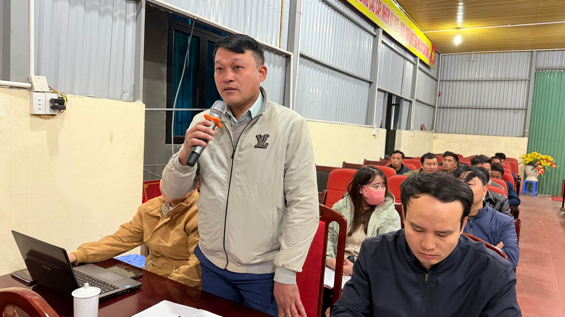 Cán bộ Phòng Văn hóa - Xã hội xã kiến nghị tại buổi tiếp xúc cử tri.