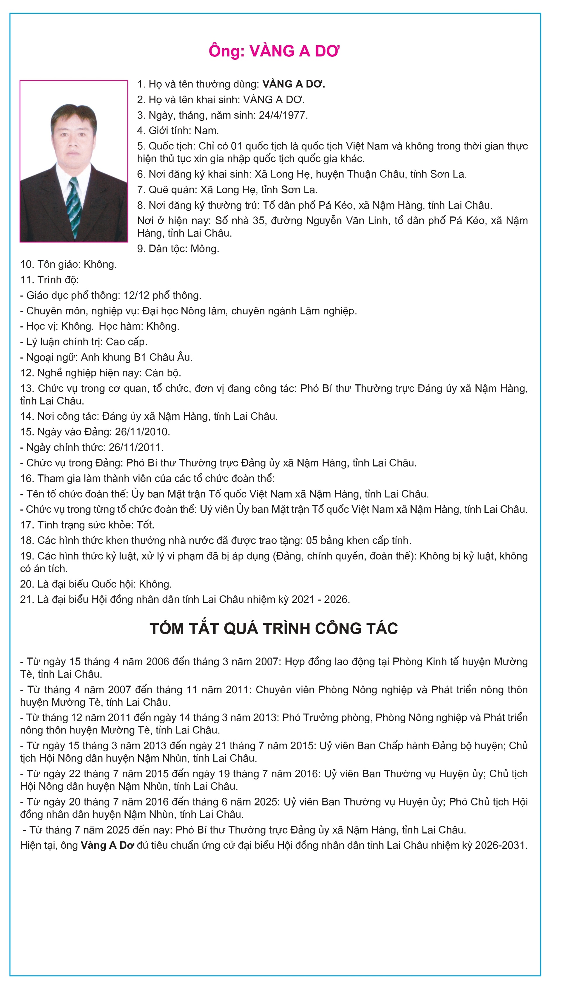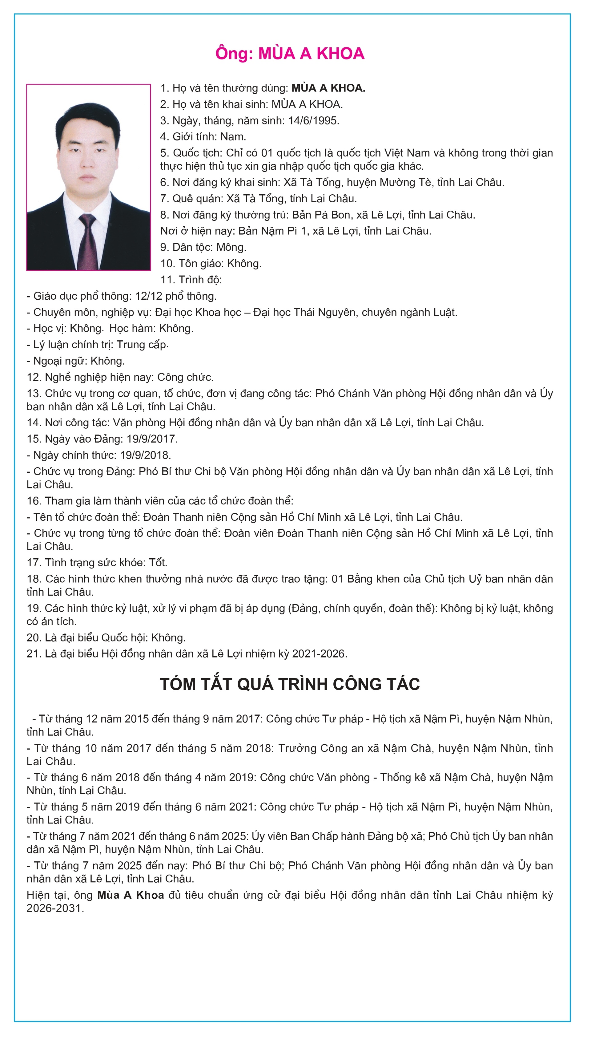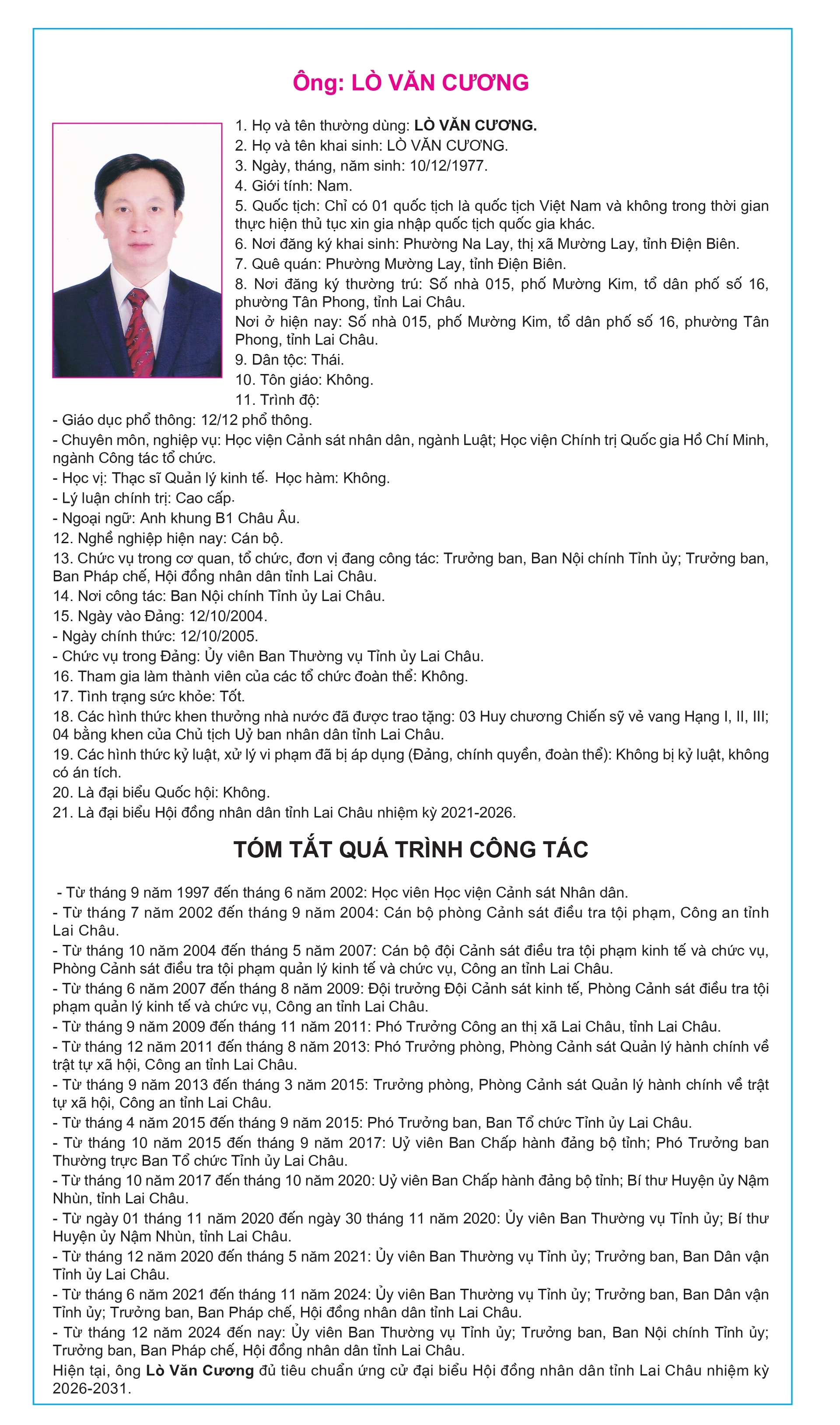 Tiểu sử tóm tắt của người ứng cử Đại biểu Hội đồng Nhân dân tỉnh Lai Châu, nhiệm kỳ 2026-2031