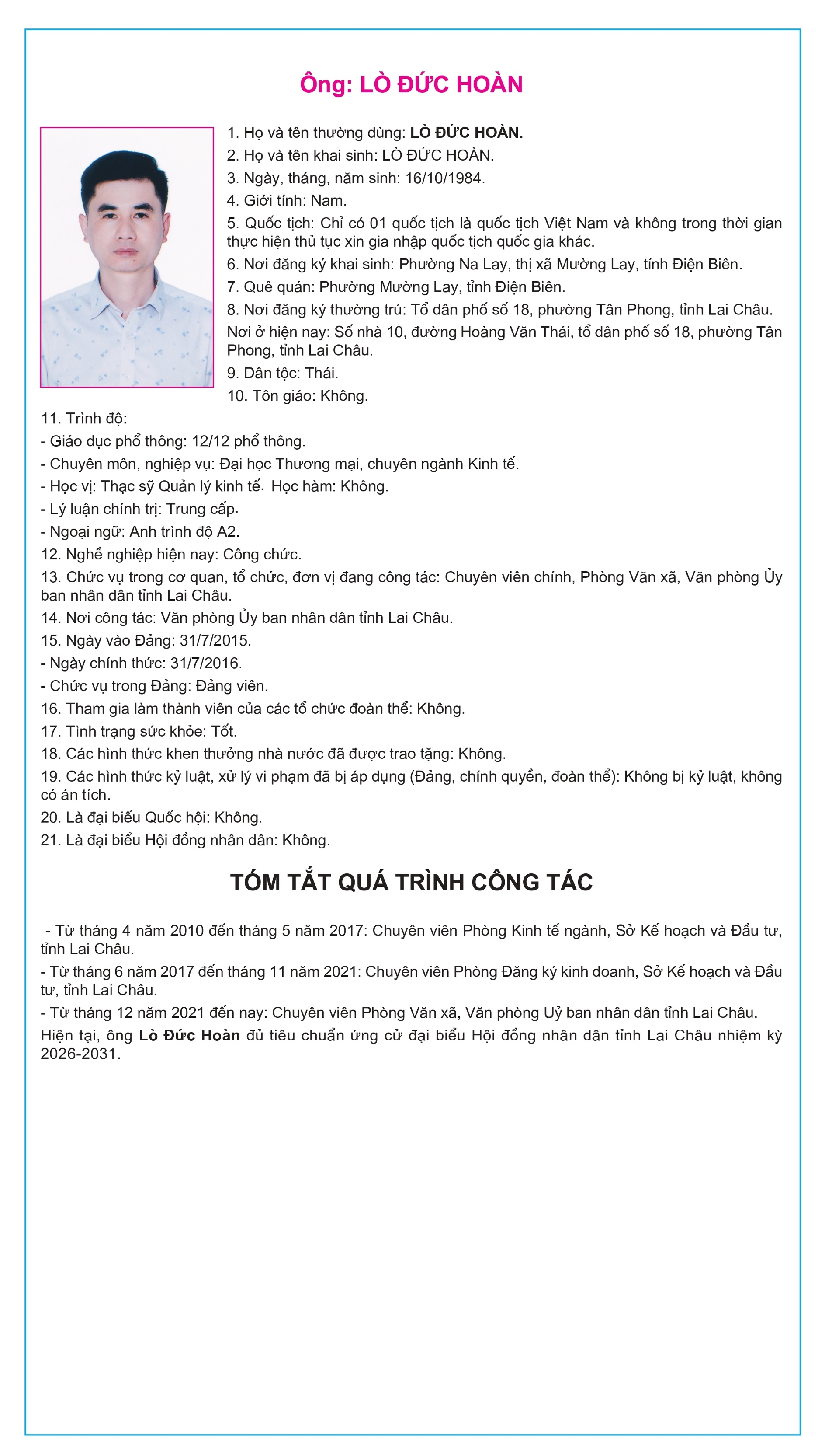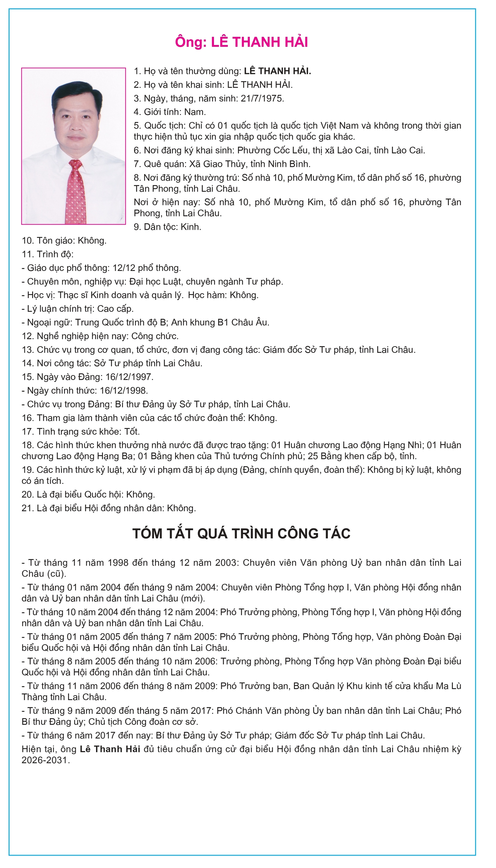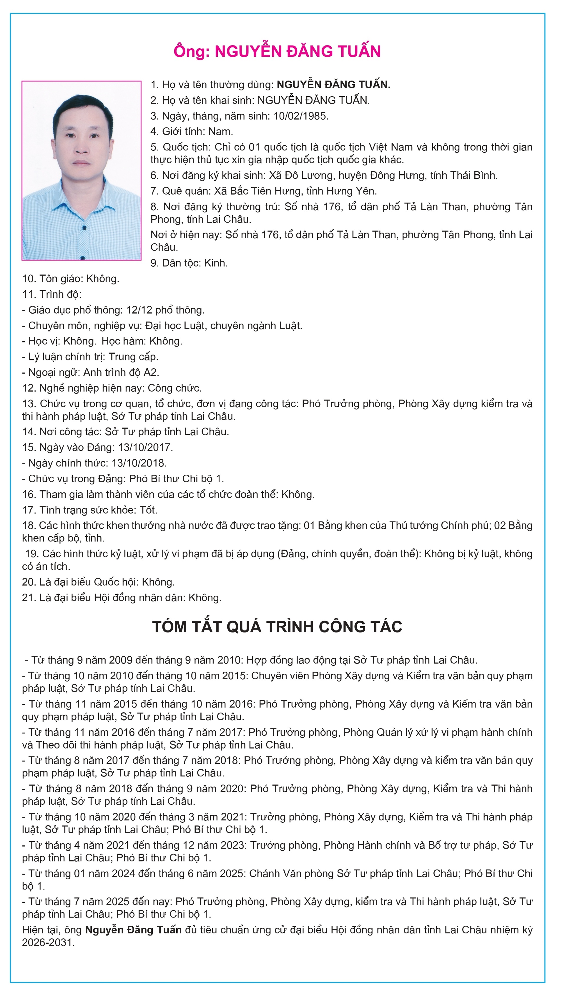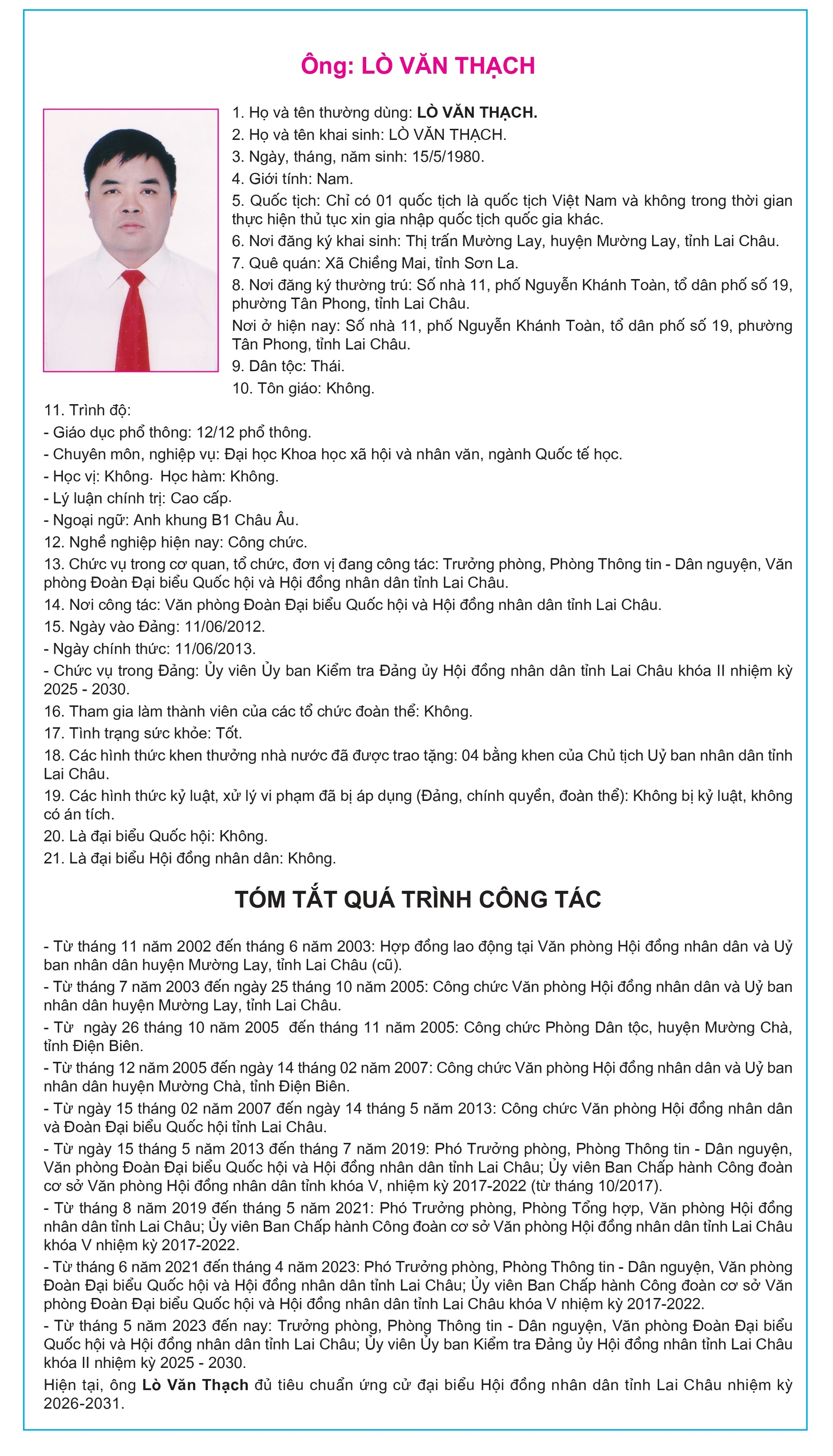 Tiểu sử tóm tắt của người ứng cử Đại biểu Hội đồng Nhân dân tỉnh Lai Châu, nhiệm kỳ 2026-2031