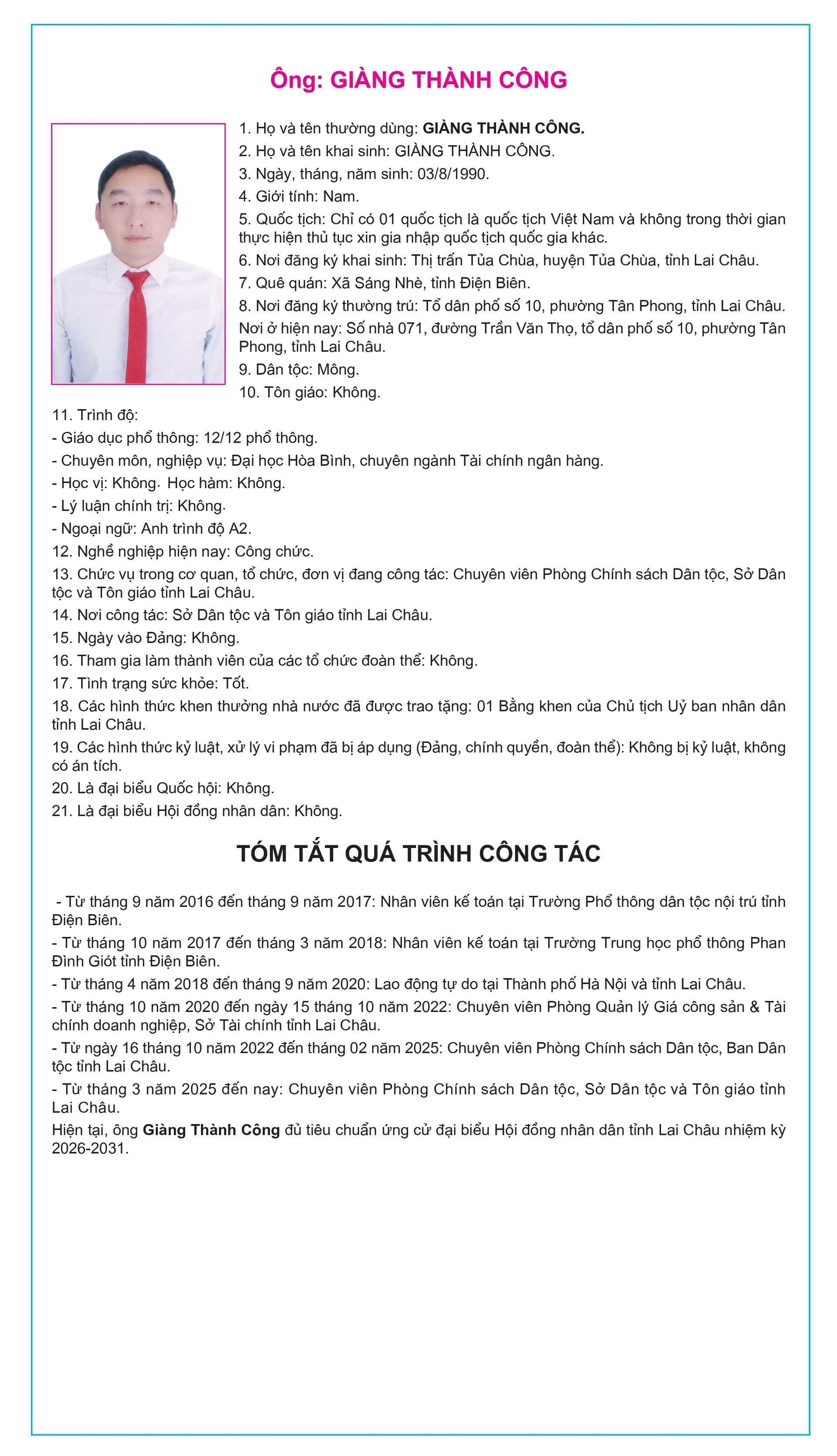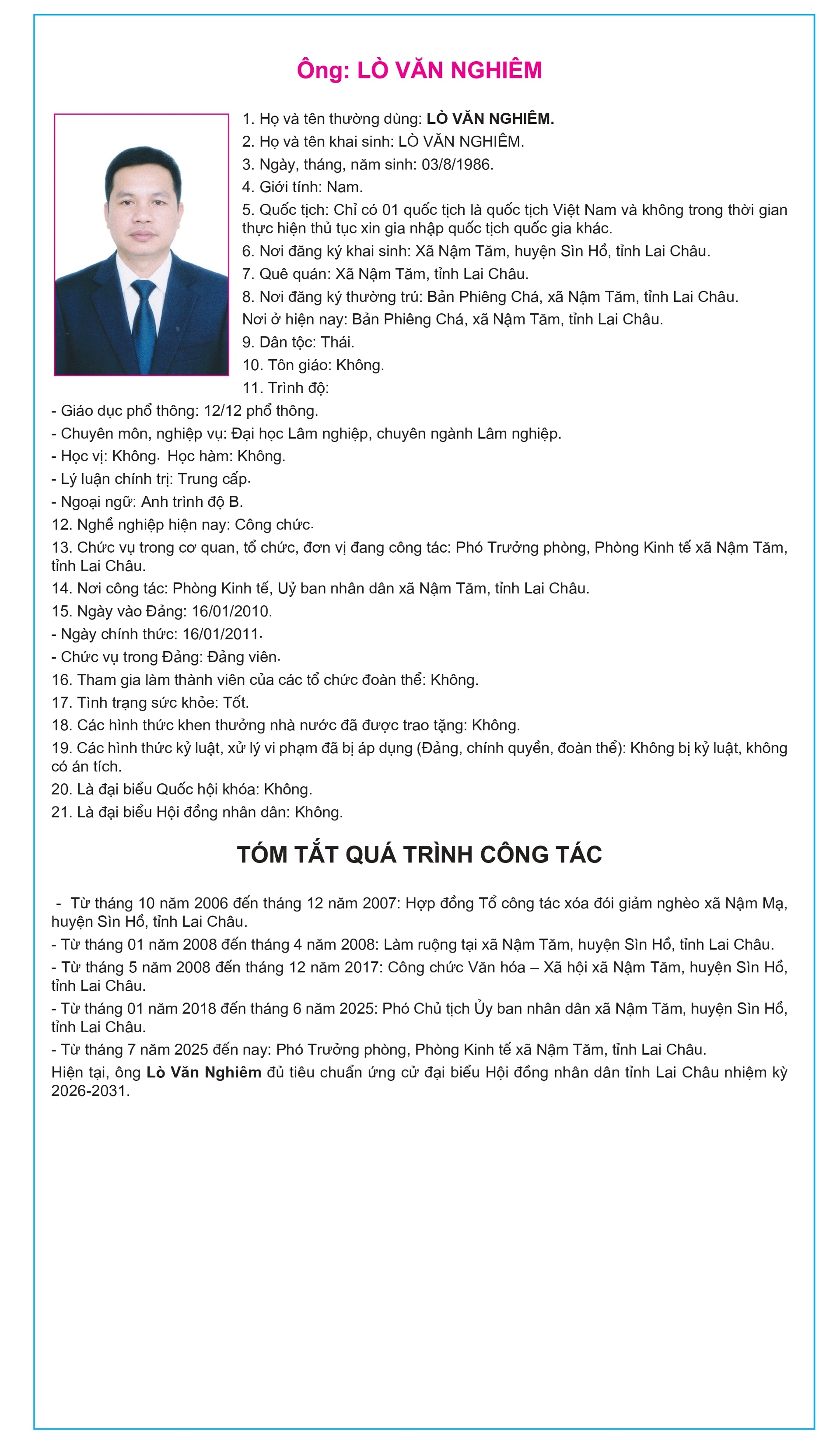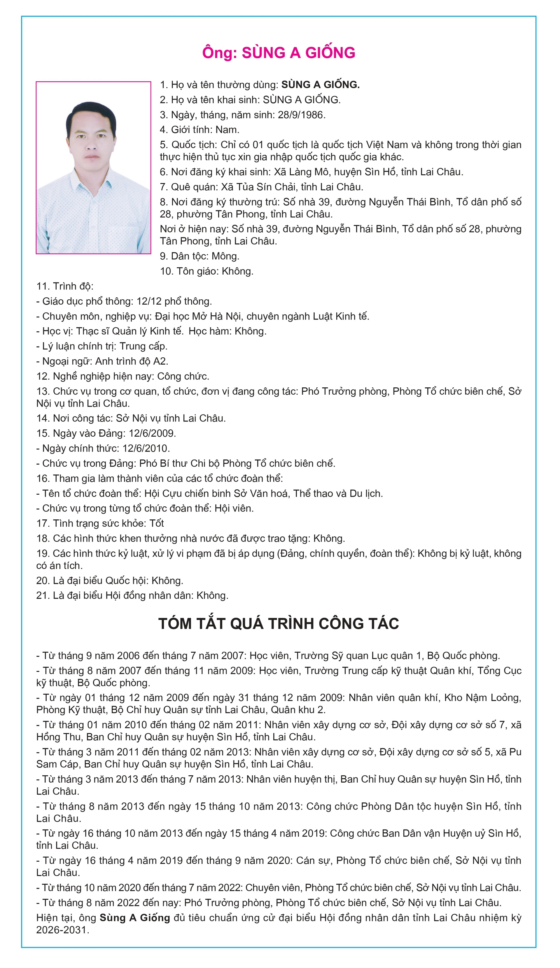 Tiểu sử tóm tắt của người ứng cử Đại biểu Hội đồng Nhân dân tỉnh Lai Châu, nhiệm kỳ 2026-2031