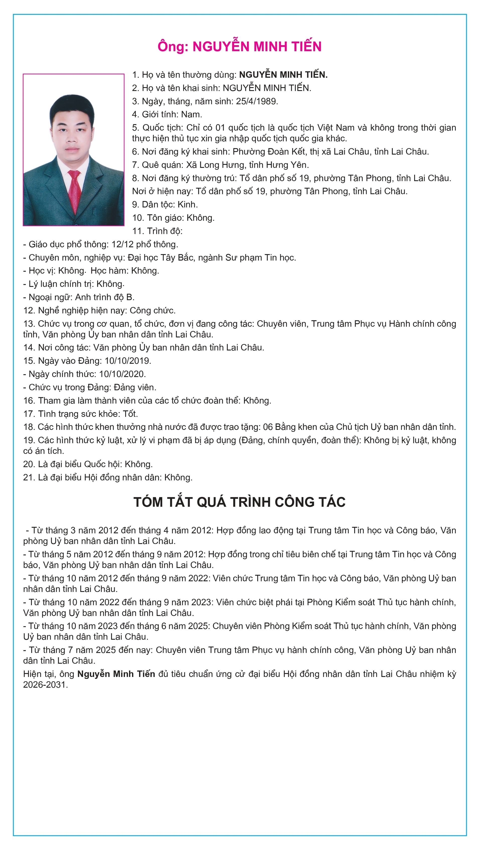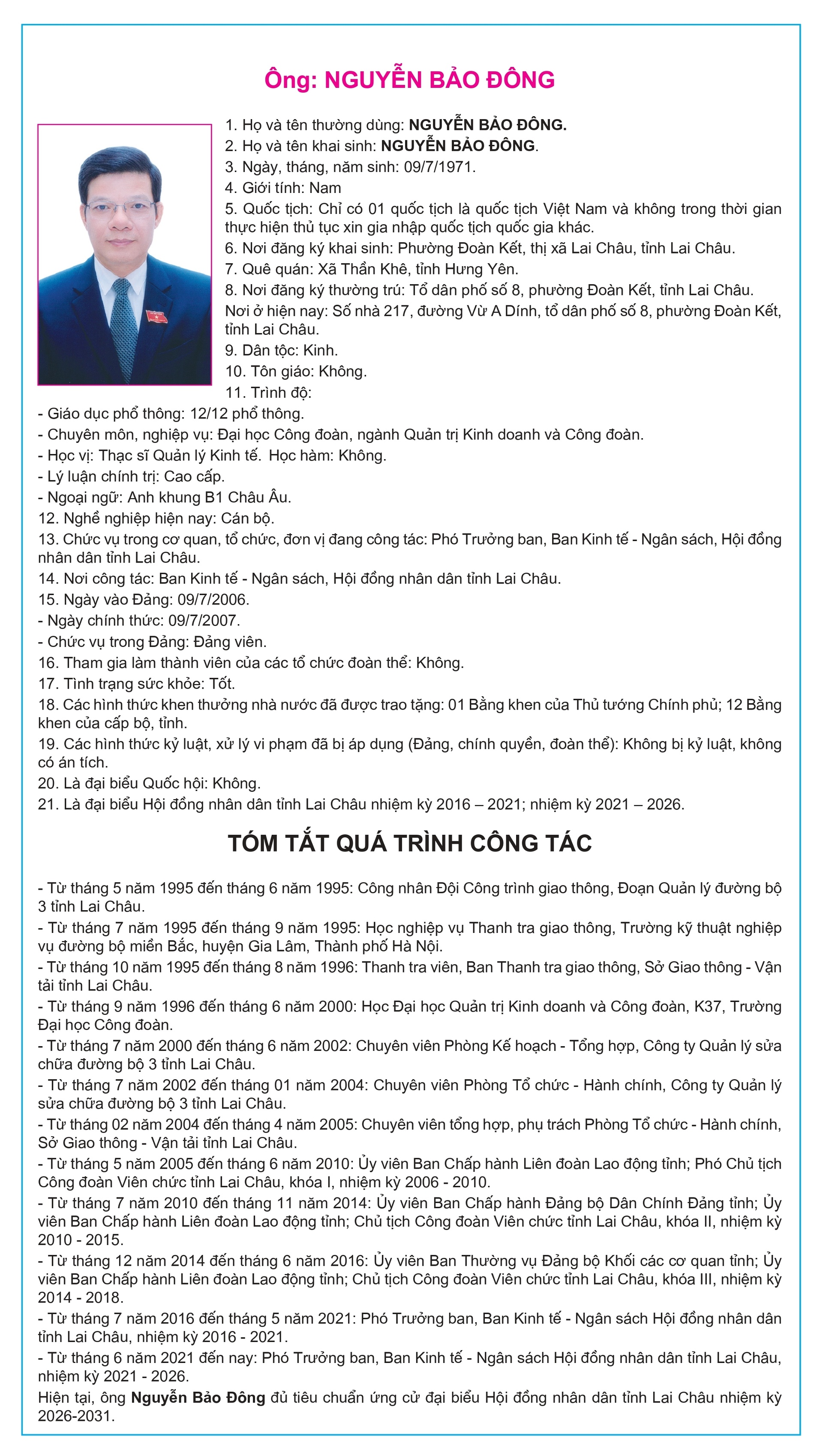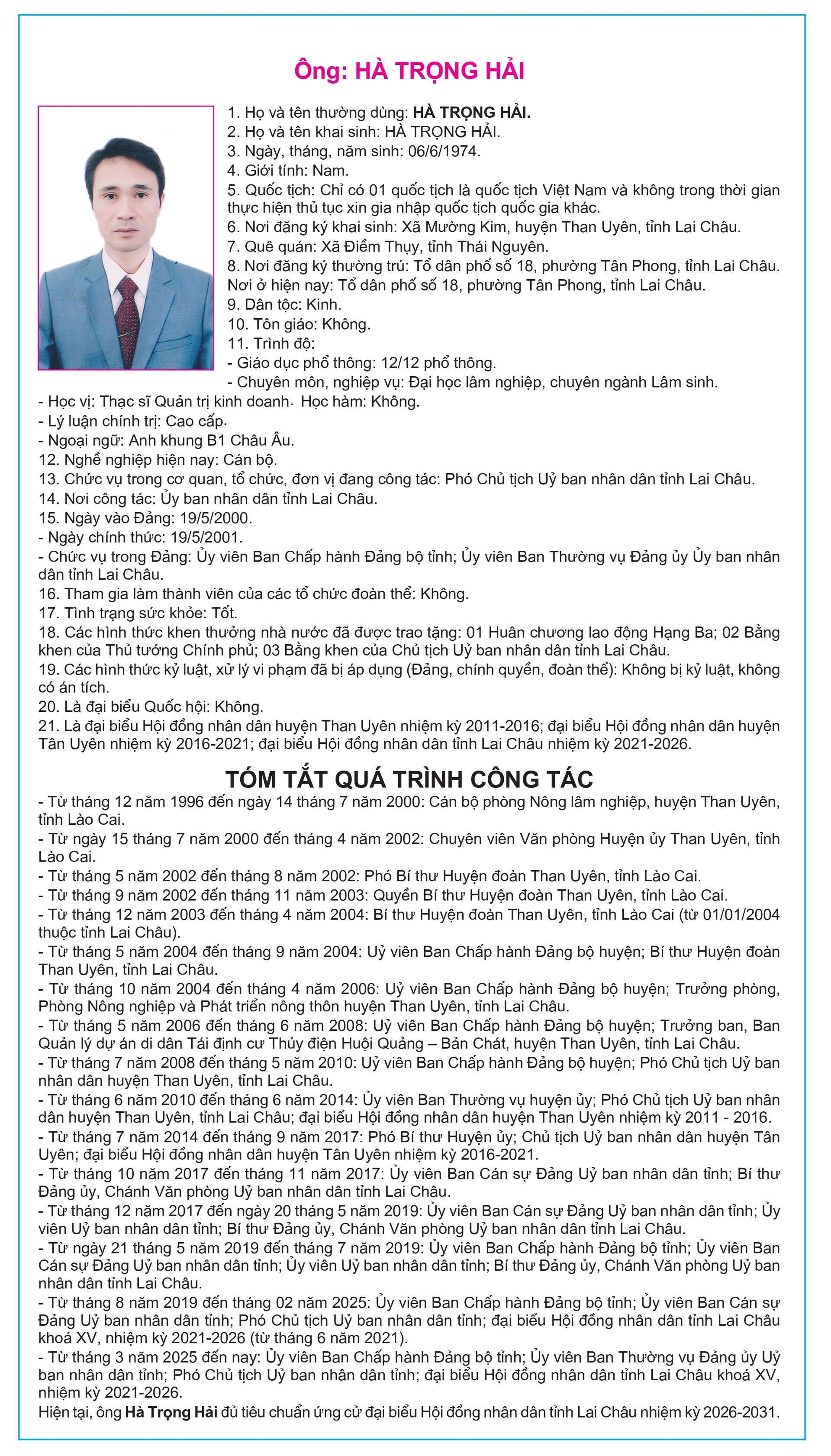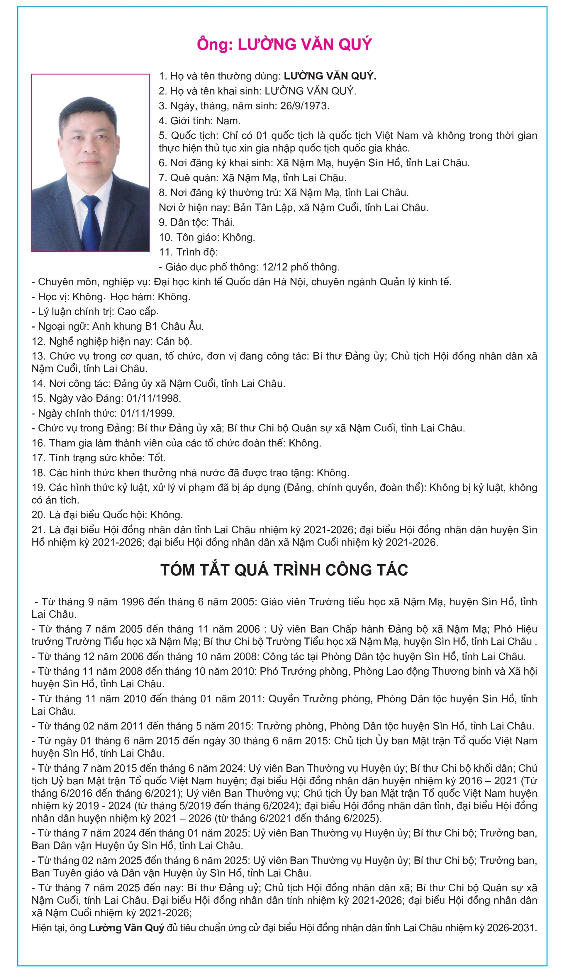 Tiểu sử tóm tắt của người ứng cử Đại biểu Hội đồng Nhân dân tỉnh Lai Châu, nhiệm kỳ 2026-2031