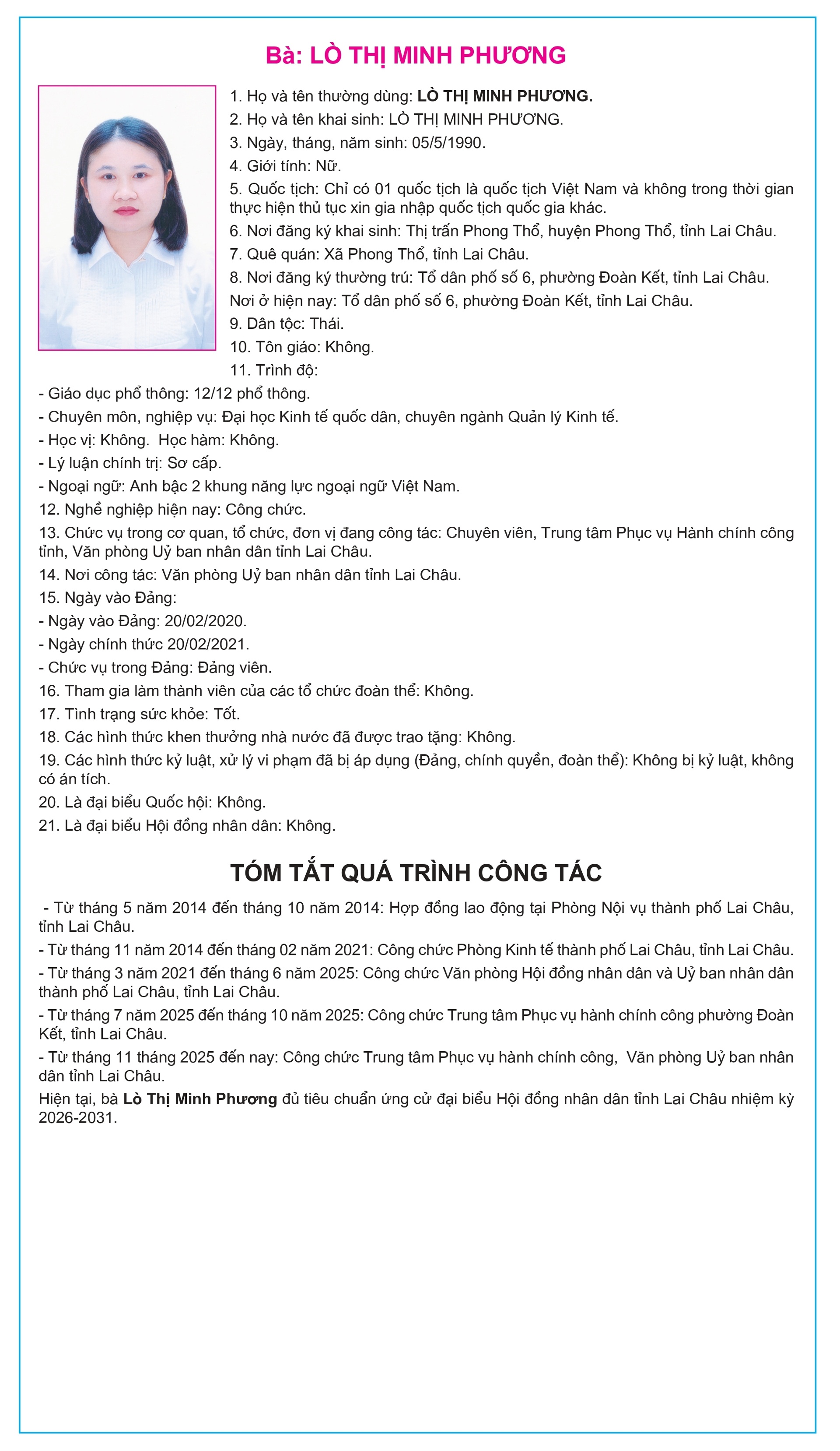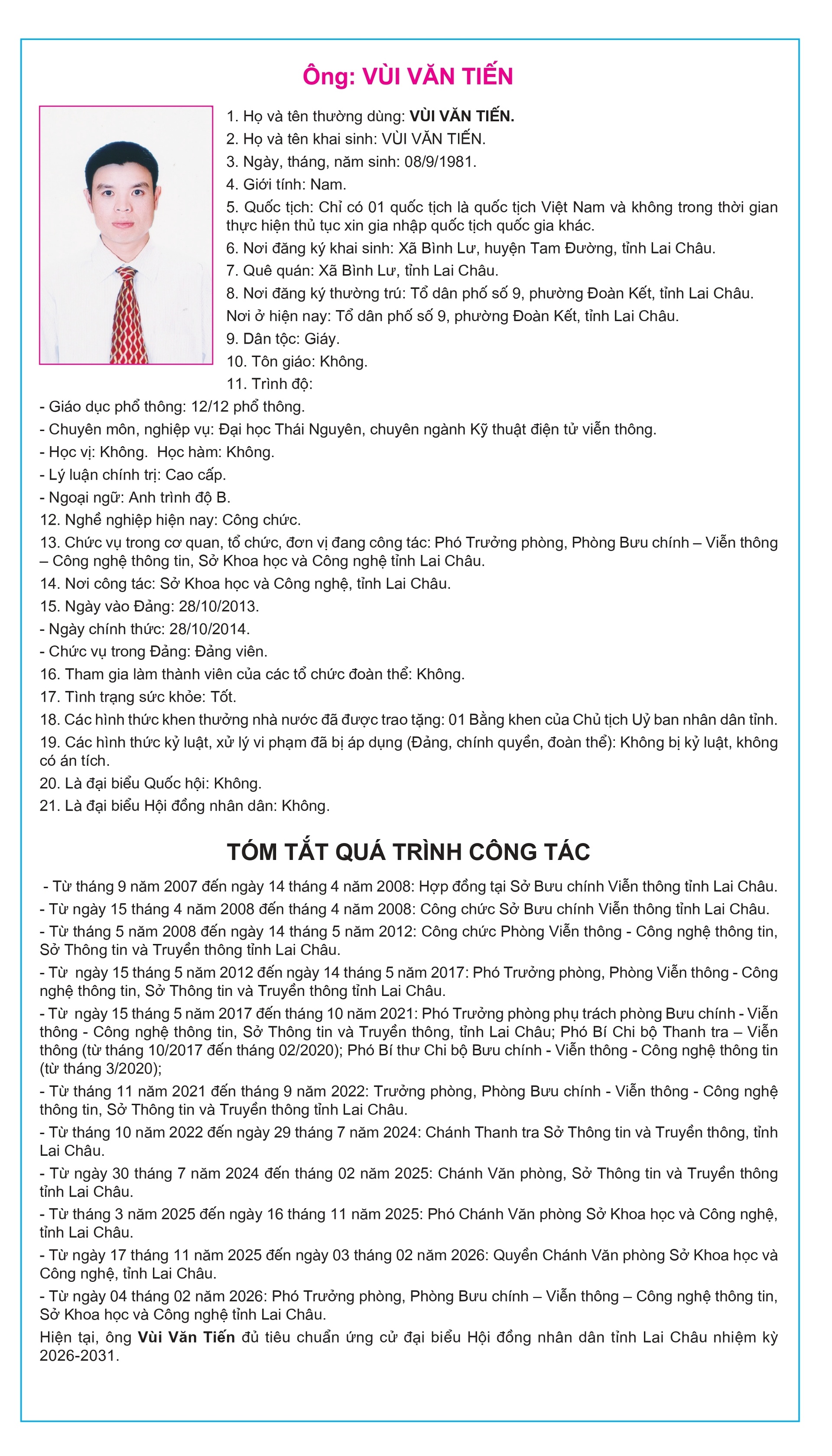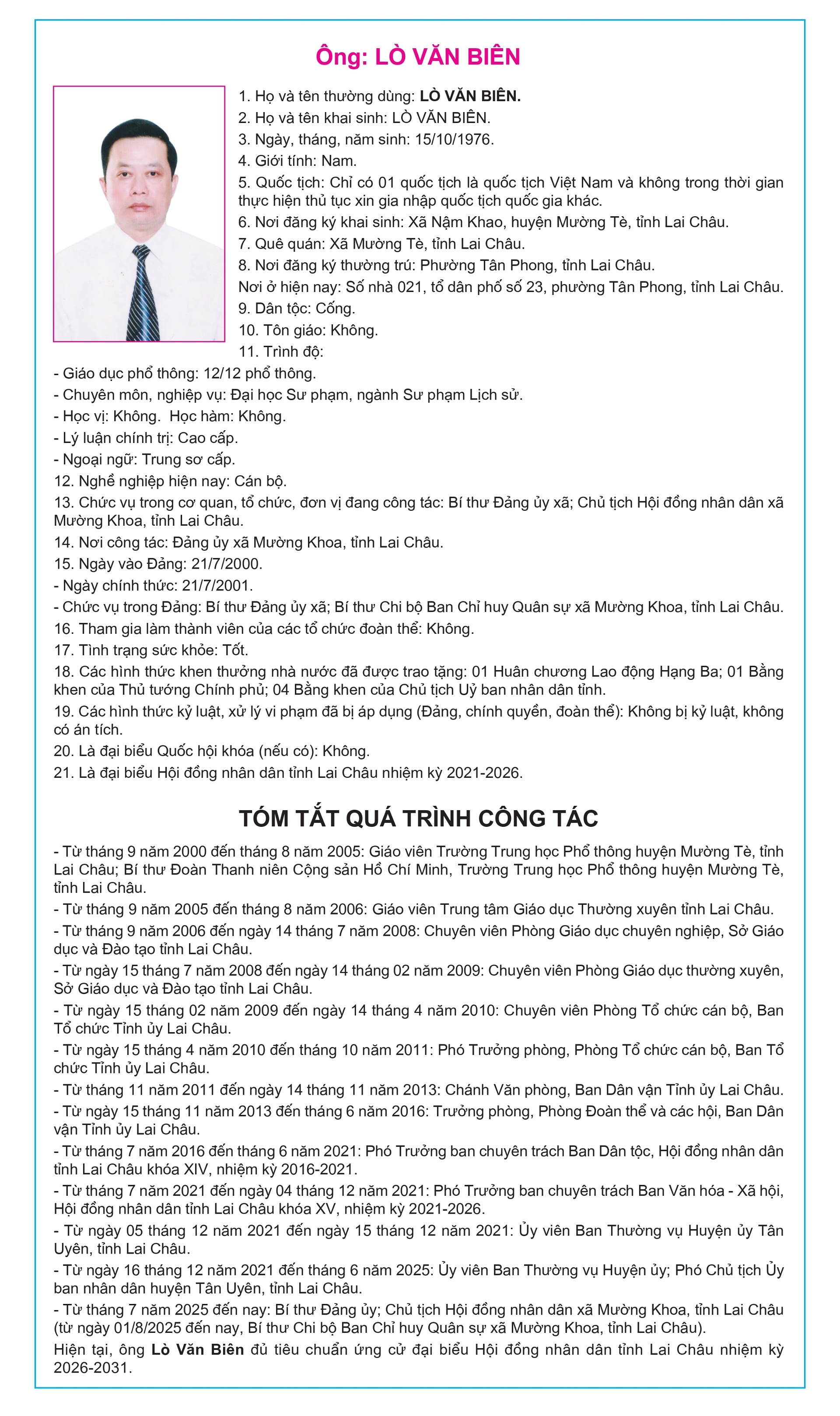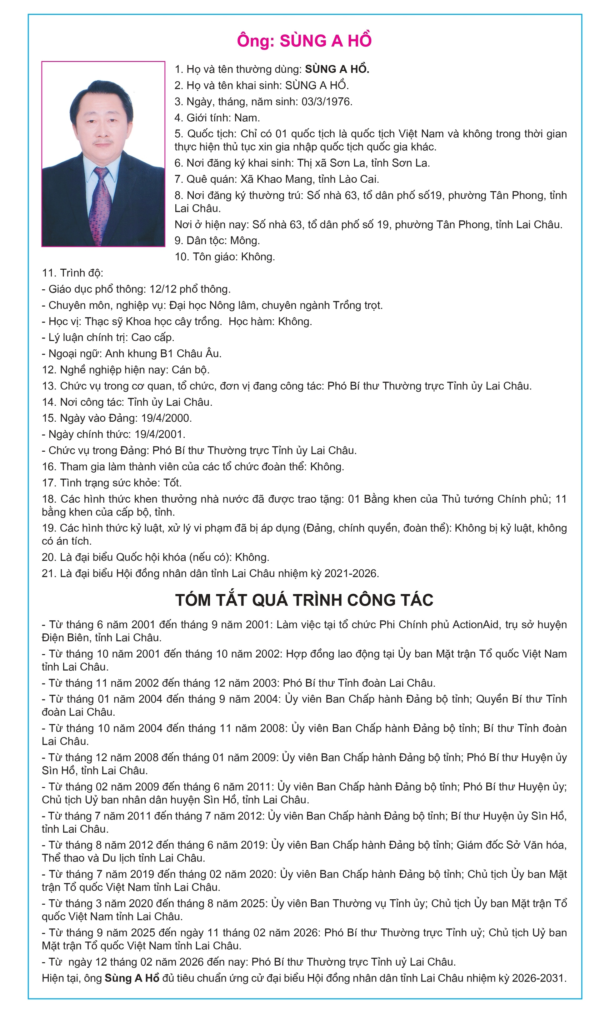 Tiểu sử tóm tắt của người ứng cử Đại biểu Hội đồng Nhân dân tỉnh Lai Châu, nhiệm kỳ 2026-2031
