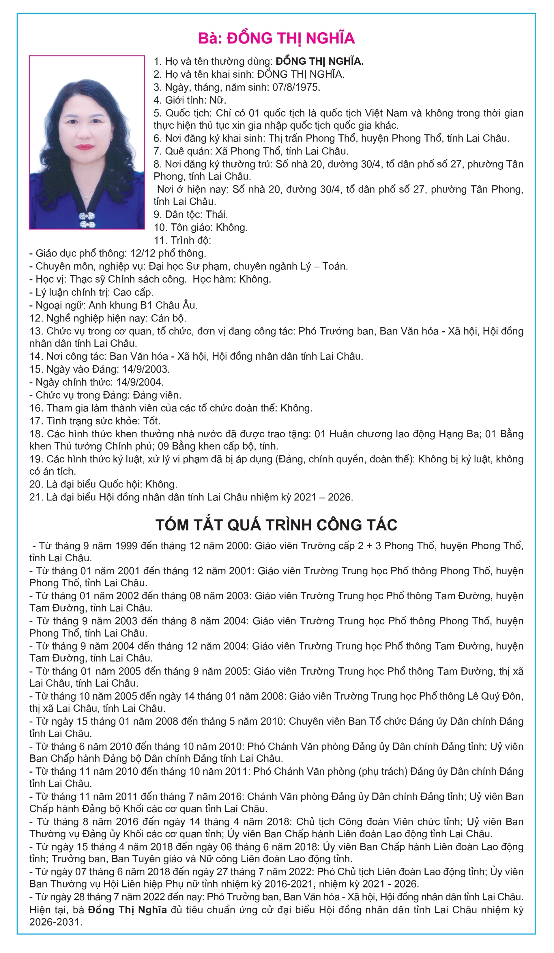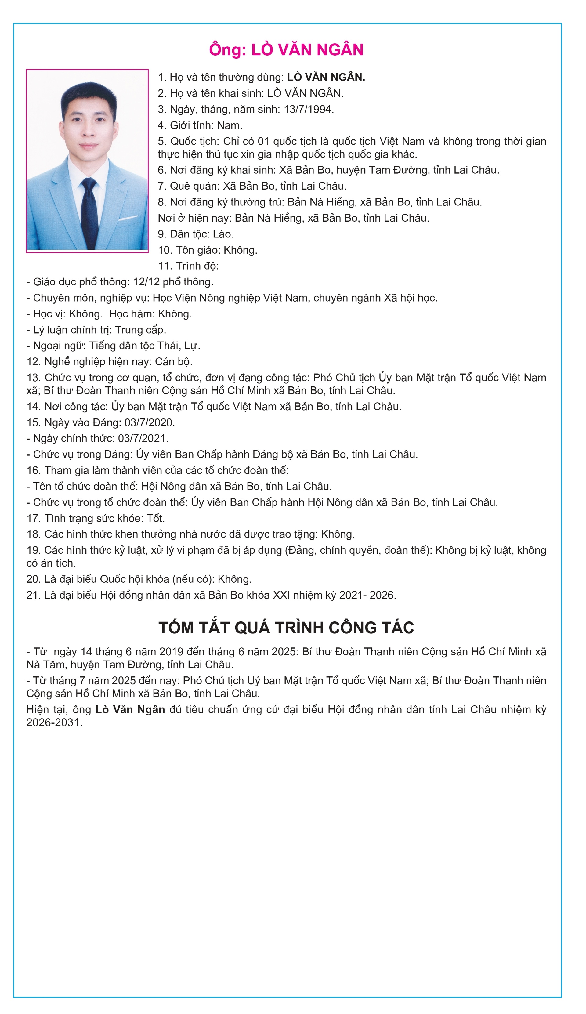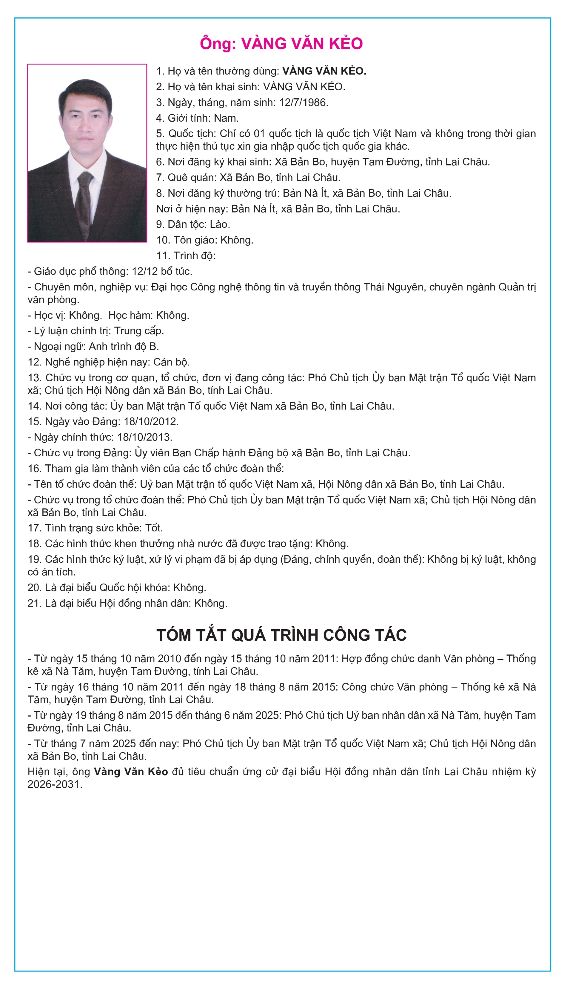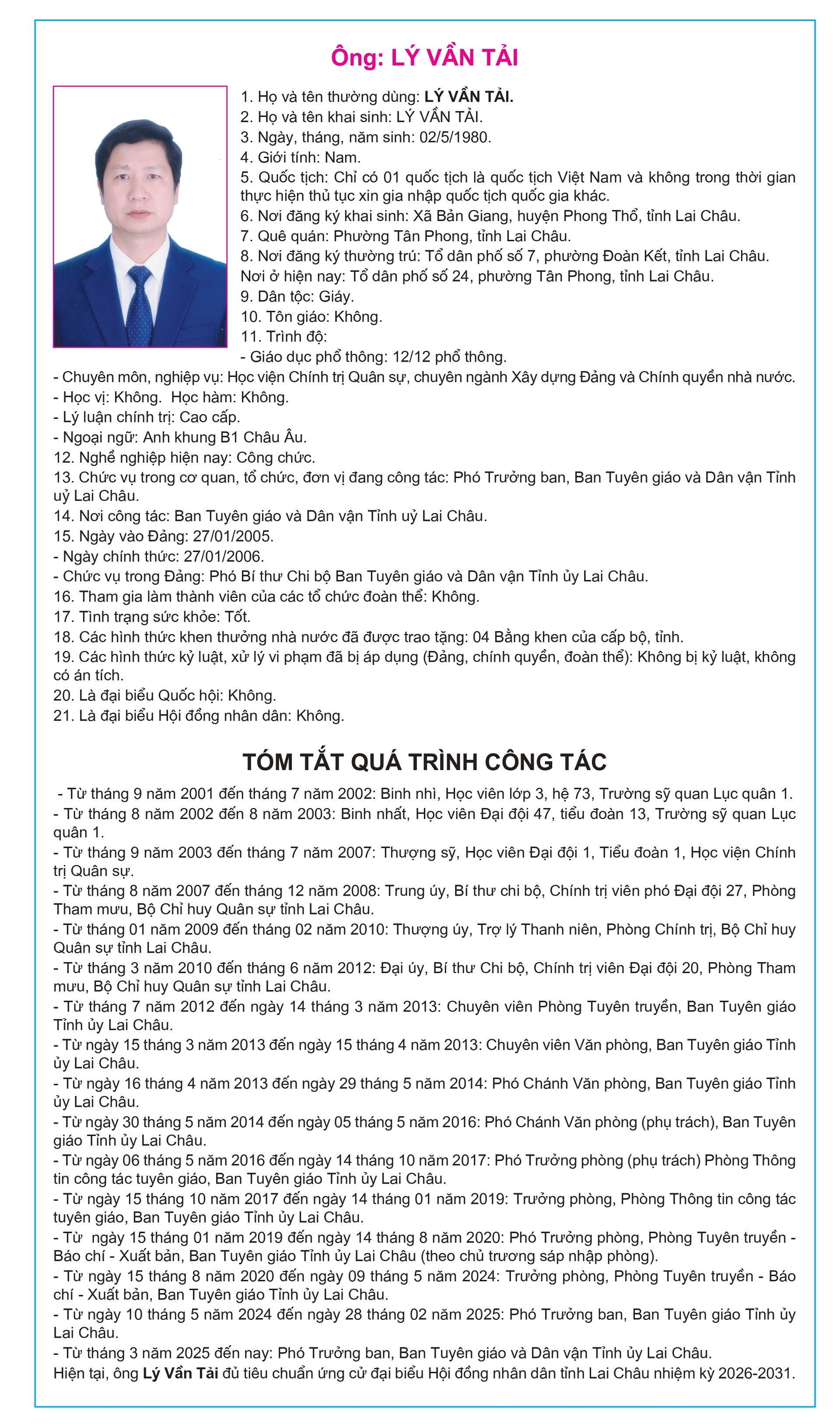 Tiểu sử tóm tắt của người ứng cử Đại biểu Hội đồng Nhân dân tỉnh Lai Châu, nhiệm kỳ 2026-2031