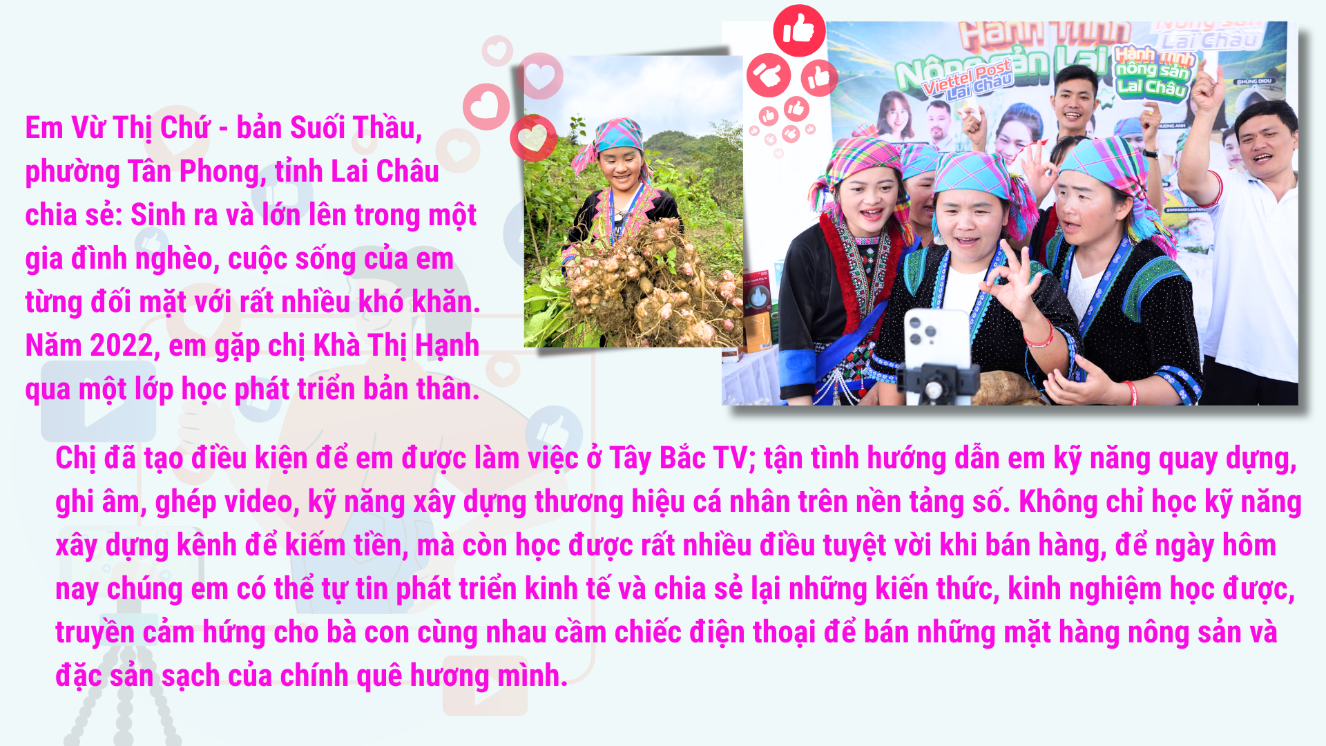 Được biết, sau 2 năm làm ở Tây Bắc TV, Chứ mạnh dạn xin ra làm riêng, chị Hạnh và Tây Bắc TV tiếp tục giúp Chứ xây dựng kênh Youtube, tiktok, facebook cá nhân. Đến nay 2 trang facebook cá nhân của em đã có hơn 250 nghìn người theo dõi; tiktok có 221 nghìn theo dõi; 2,9 triệu người thích. Trong năm 2025, Sở Công thương và một số xã mời Chứ tham gia hướng dẫn bà con cách bán hàng trên mạng. Phối hợp với kênh facebook của Tây Bắc TV, Chứ và những người bạn đã giúp nhiều bà con trong tỉnh bán các mặt hàng nông sản online. Gần đây nhất là chuyến đi quảng bá, bán chè cho bà con xã Than Uyên, hướng dẫn livestream bán khoai sâm ở Trung tâm thương mại tỉnh… Phiên livestream tập sự ngắn gọn để hướng dẫn nhưng đã giúp bà con chốt đơn hơn 30 triệu đồng. Đặc biệt phiên livestream ngày cuối năm 2025 đã giúp bà con ở xã Sìn Hồ bán được hơn 300 tấn khoai sâm, doanh số thu về hơn 100 triệu đồng. 3 lần Chứ được Sở Công thương gửi thư khen và tặng quà. Tỉnh đoàn mời tham dự Đại hội Đại biểu Đoàn thanh niên cộng sản Hồ Chí Minh tỉnh Lai Châu lần thứ XV. Đến nay, Chứ không chỉ tự chủ được sinh kế, vững về kinh tế mà em còn cùng các chị em trong bản tiếp tục lan tỏa con đường phát triển bền vững từ nông sản bản địa, đặc sản địa phương.