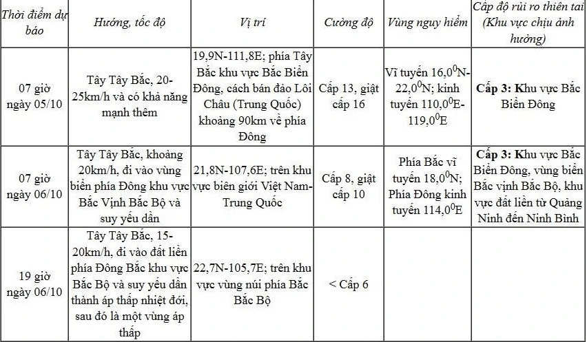 Từ chiều 5/10, vùng biển phía Đông Bắc vịnh Bắc Bộ (bao gồm Bạch Long Vĩ) gió mạnh dần lên cấp 6-7, sau tăng lên cấp 8-9. Tối 5/10, khu vực Bắc vịnh Bắc Bộ (Bạch Long Vĩ, Vân Đồn, Cô Tô, Cát Hải, Hòn Dấu) gió mạnh dần lên cấp 8-9, sóng cao 2-4m. Vùng gần tâm bão có gió cấp 10-11, giật cấp 14, sóng cao 3-5m, biển động dữ dội, rất nguy hiểm đối với tàu thuyền.