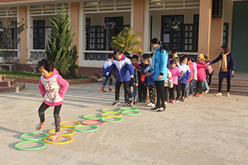 Học sinh Trường Tiểu học Quyết Tiến chơi trò chơi đầu giờ buổi sáng.