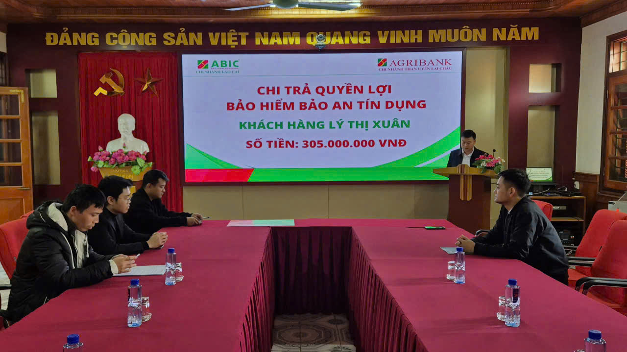 Công ty Cổ phần Bảo hiểm Ngân hàng Nông nghiệp (ABIC) Chi nhánh Lào Cai, Phòng Kinh Doanh khu vực Lai Châu vừa phối hợp với Agribank Chi nhánh Than Uyên thực hiện chi trả quyền lợi bảo hiểm Bảo an tín dụng cho khách hàng với tổng số tiền 305 triệu đồng (gồm 300 triệu đồng tiền gốc, 3 triệu đồng tiền lãi, 2 triệu đồng tiền hỗ trợ mai táng phí).