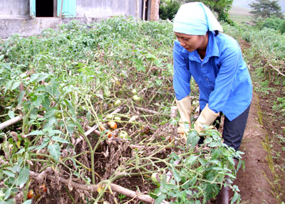 | Chị Nguyễn Thị Hiến, ở bản Nà Đa kiểm tra vườn cà chua. |