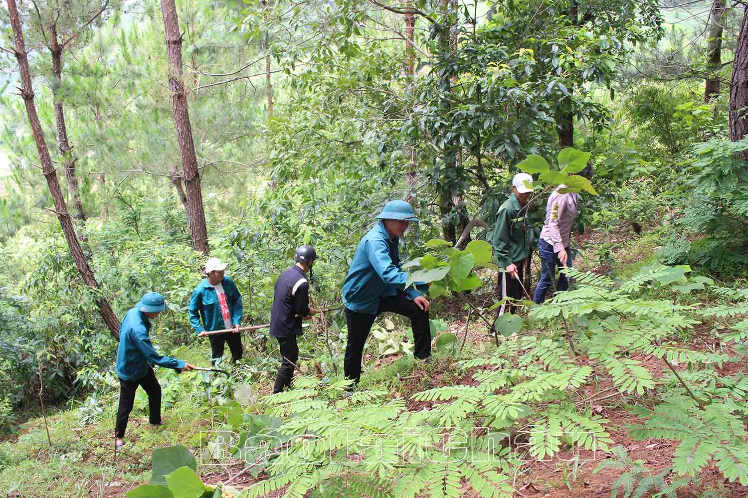 Người dân bản Chiềng Ban 1 (xã Mường Kim, huyện Than Uyên) phát dọn đường băng cản lửa.