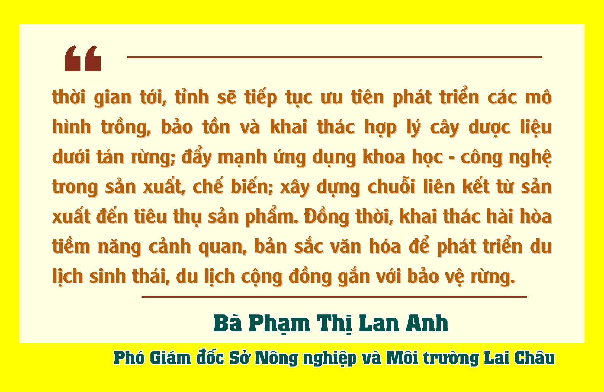 Địa hình núi cao, khí hậu mát mẻ, độ ẩm lớn, diện tích đất lâm nghiệp chiếm tỷ lệ cao là điều kiện thuận lợi để tỉnh phát triển kinh tế dưới tán rừng. Hiện nay, toàn tỉnh có hơn 10.700ha cây dược liệu và lâm sản ngoài gỗ, trong đó khoảng 9.000ha được trồng dưới tán rừng. Nhiều loại cây như: thảo quả, sa nhân, tam thất, sâm Lai Châu, thất diệp nhất chi hoa… từng bước trở thành cây trồng chủ lực, gắn với sinh kế của người dân ở nhiều địa phương. Đặc biệt, tỉnh có trên 280.000ha đất có độ cao tuyệt đối trên 900m, trong đó đất lâm nghiệp chiếm 75%. Lai Châu được đánh giá là địa phương có dư địa rất lớn để phát triển kinh tế dưới tán rừng, nhất là trồng cây dược liệu.