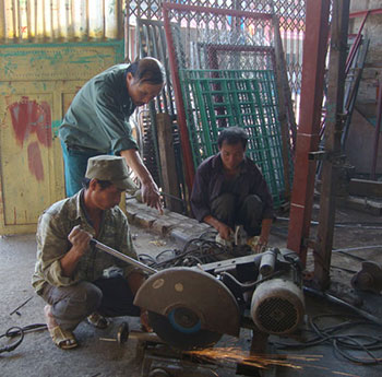Ông Mai Viết Duy (ở giữa) hướng dẫn công nhân sử dụng máy gia công cơ khí.