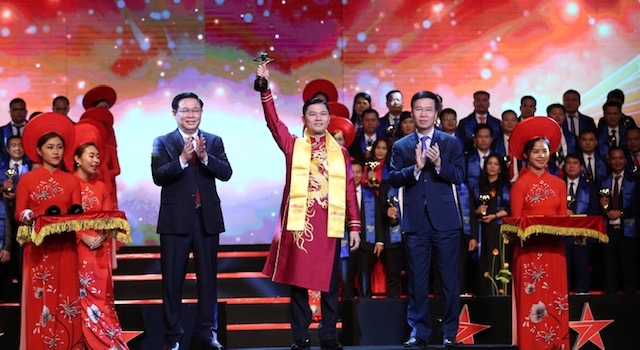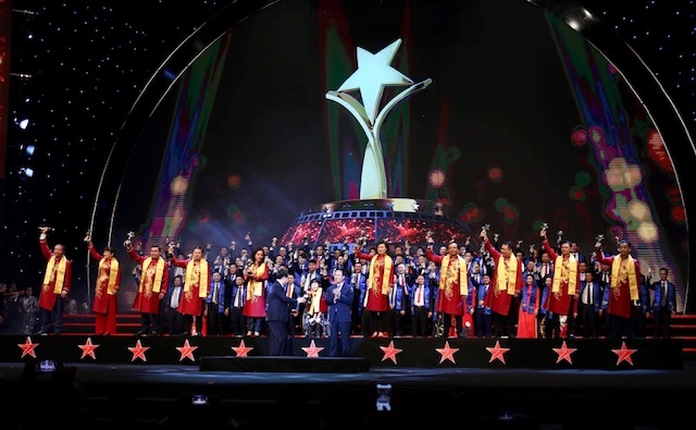 Phó Thủ tướng Chính phủ Vương Đình Huệ và Trưởng ban Tuyên giáo Trung ương Võ Văn Thưởng trao giải thưởng Sao đỏ năm 2019 cho doanh nhân trẻ xuất sắc