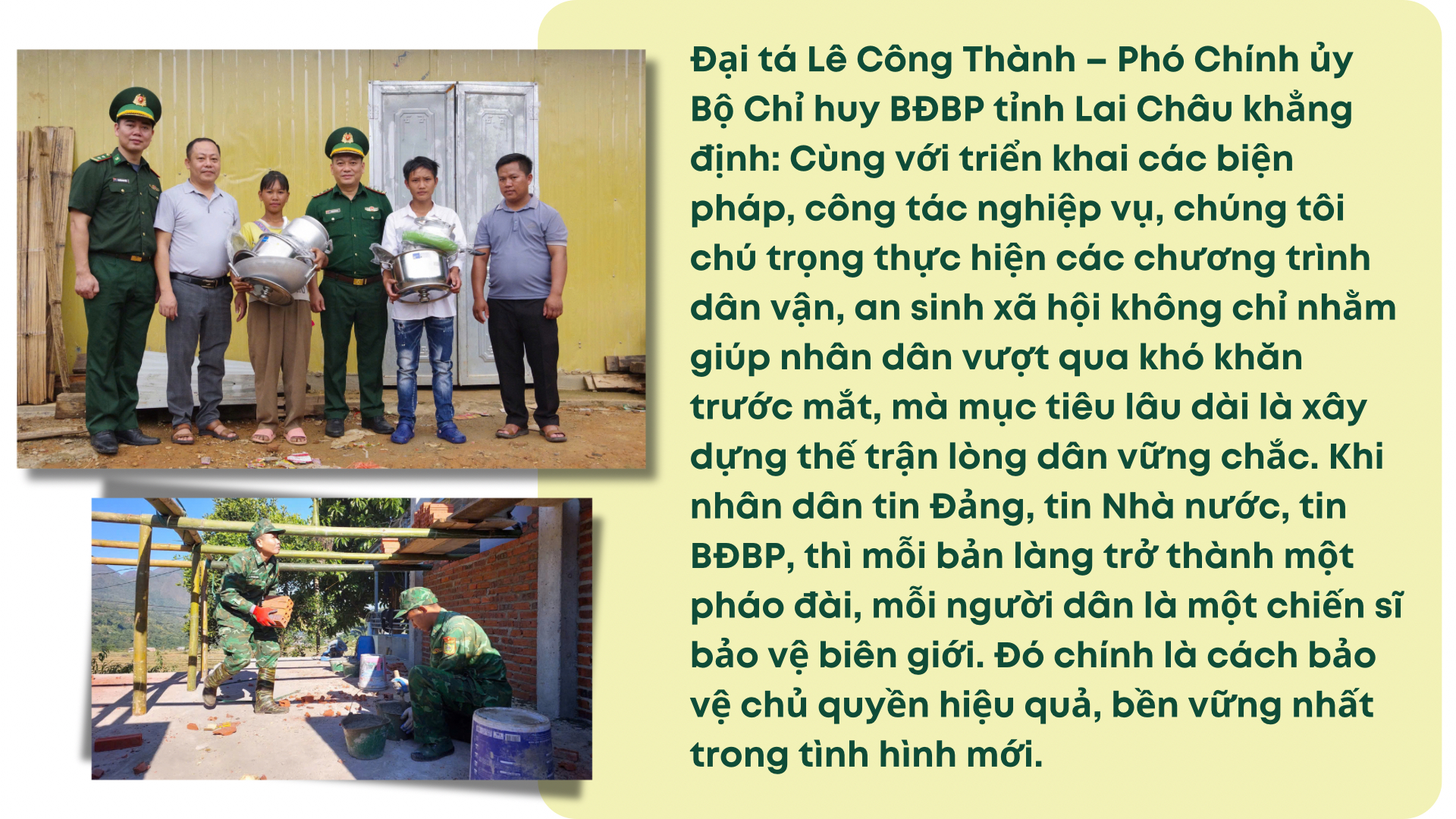 Biên giới không chỉ được giữ gìn bằng những chốt gác hay đường tuần tra, mà được bảo vệ từ niềm tin và sự gắn bó của nhân dân. Từ những căn nhà mới, những mô hình sinh kế bền vững, đến những mùa xuân ấm áp nghĩa tình, BĐBP Lai Châu đang bền bỉ dựng xây thế trận lòng dân vững chắc – nền tảng lâu dài cho biên cương bình yên, phát triển, góp phần làm giàu thêm sức sống cho mảnh đất biên viễn nơi cực Tây Bắc Tổ quốc.