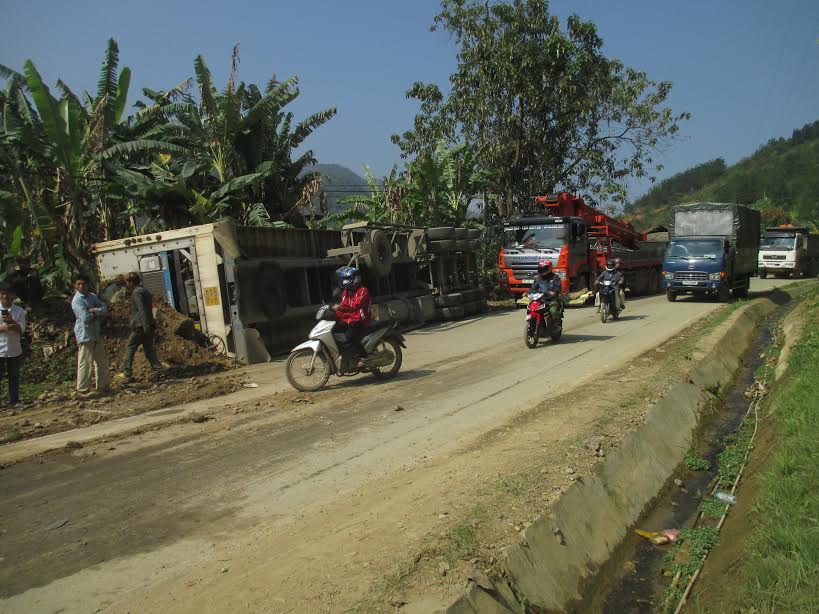 Hiện trường vụ lật xe côngtenơ ngày 5/4/2017 tại tuyến đường vào Cửa khẩu Ma Lù Thàng (huyện Phong Thổ).