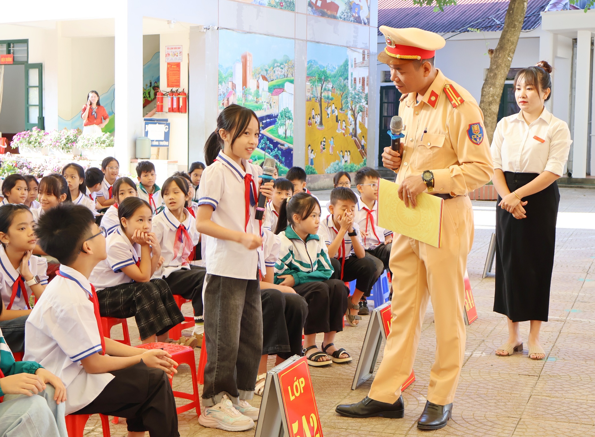 Cán bộ Đội Tuyên truyền - Điều tra giải quyết tai nạn và Xử lý vi phạm giao lưu với các em học sinh thông qua các câu hỏi tìm hiểu Luật Trật tự, an toàn giao thông.