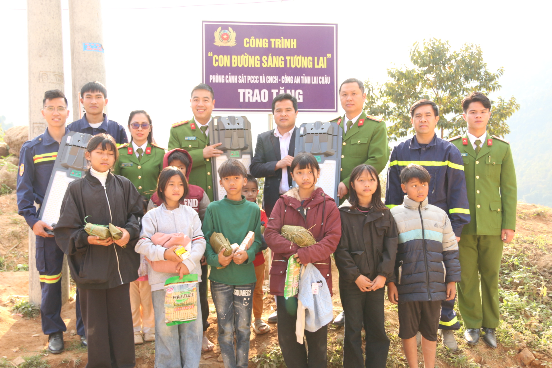 Nhân dịp này, Phòng Cảnh sát PCCC & CNCH, Công an tỉnh Lai Châu đã trao tặng 15 đèn năng lượng mặt trời, tổng trị giá gần 20 triệu đồng, góp phần thắp sáng đường đến trường, cải thiện điều kiện sinh hoạt cho học sinh và người dân địa phương.