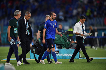 Chỉ vài phút sau đó, trung vệ đội trưởng của ĐT Ý đã không thể thi đấu tiếp do chấn thương và phải rời sân để nhường chỗ cho Acerbi. Ảnh: UEFA