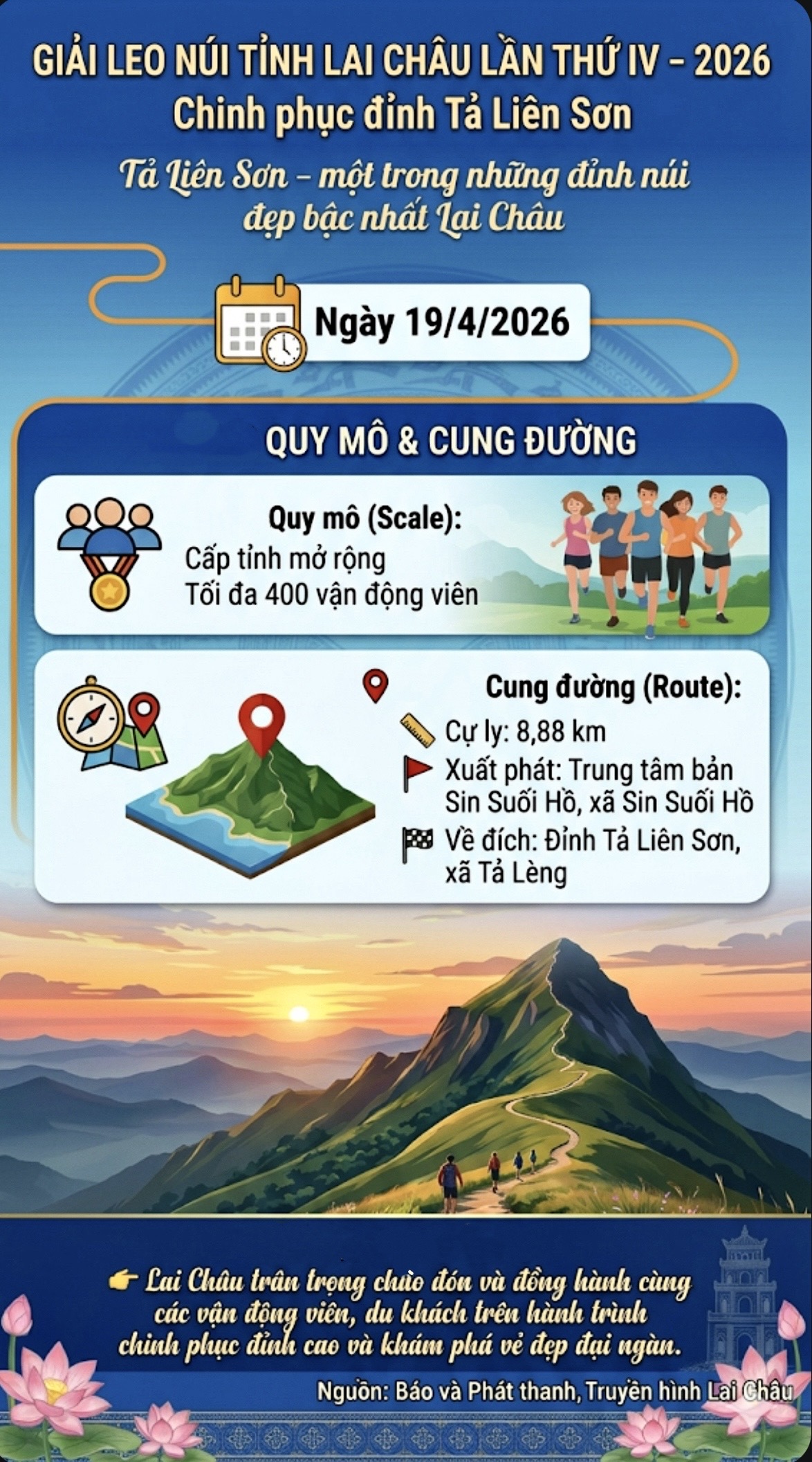Giải Leo núi tỉnh Lai Châu lần thứ IV năm 2026 “Chinh phục đỉnh Tả Liên Sơn” hứa hẹn mang đến hành trình trải nghiệm đáng nhớ, nơi các vận động viên và du khách được thử thách giới hạn bản thân, hòa mình vào thiên nhiên hùng vĩ và khám phá trọn vẹn vẻ đẹp độc đáo của du lịch Lai Châu.