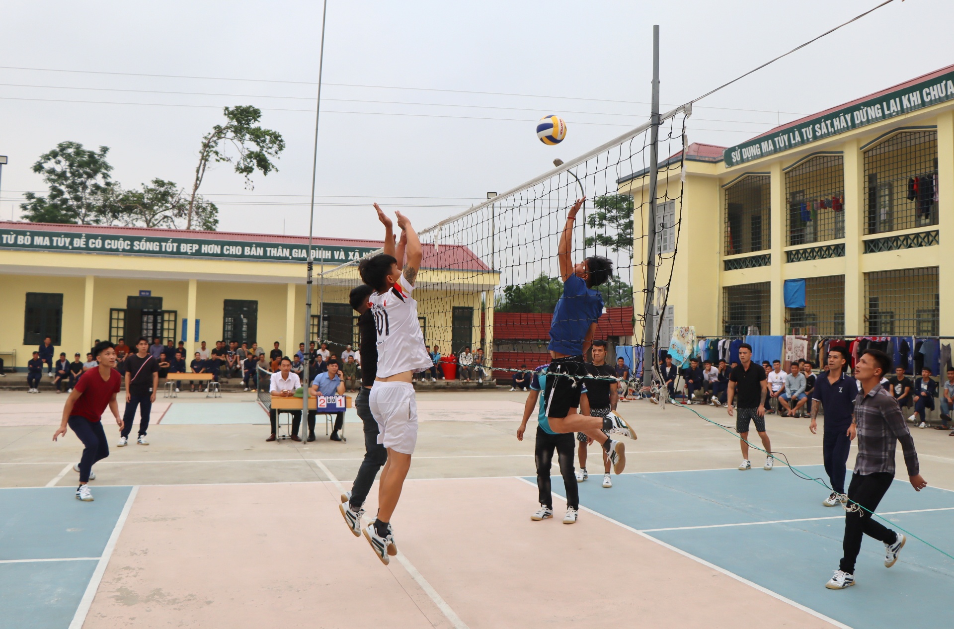 Các học viên thi đấu môn bóng chuyền...