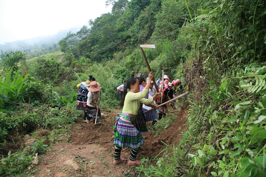 Người dân bản Nậm Béo mở đường giao thông nông thôn, góp phần đẩy nhanh tiến độ đưa điện về bản.