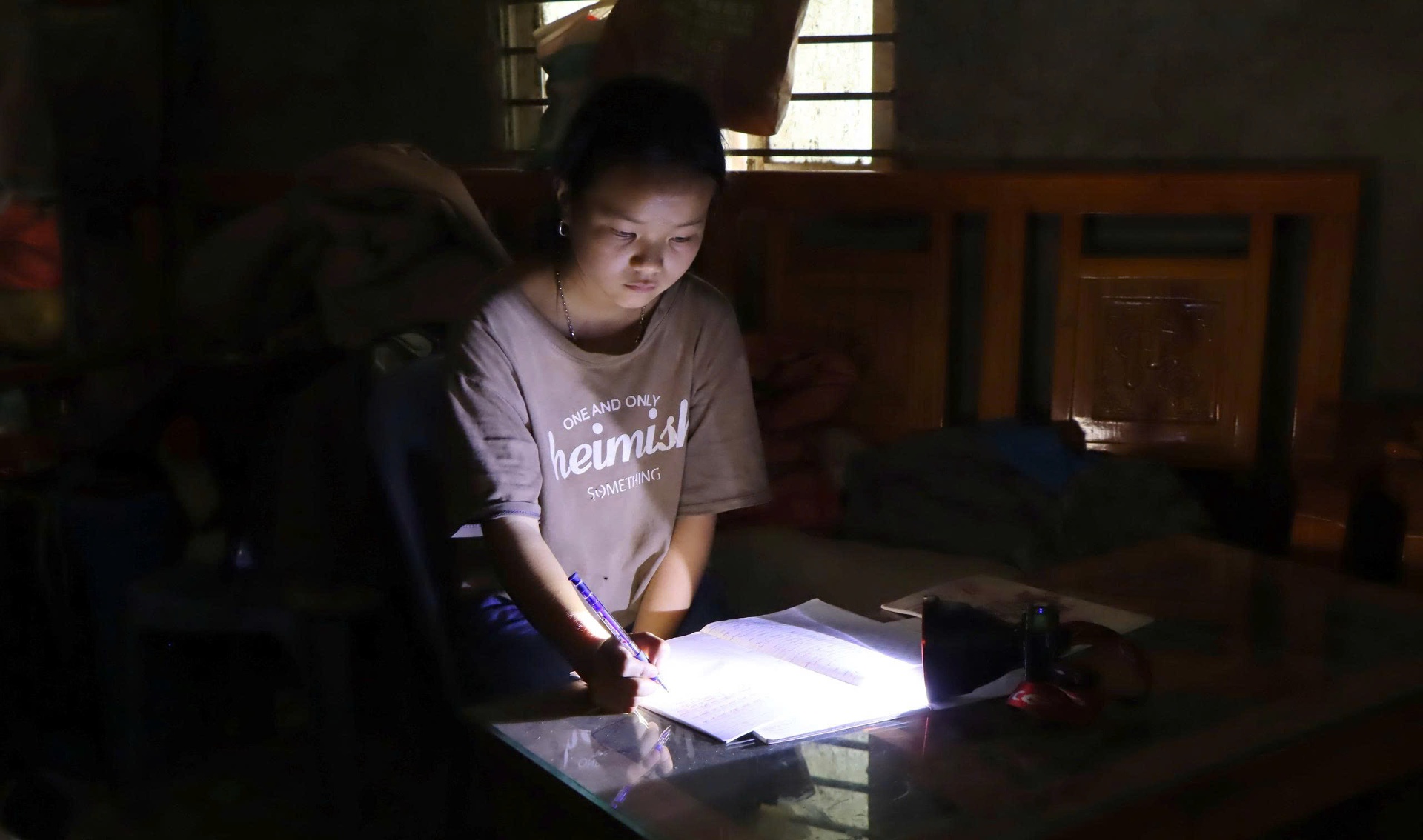 Em Ma Thị Phê ở Xa Tổng học bài dưới ánh đèn pin bởi không có điện lưới quốc gia.