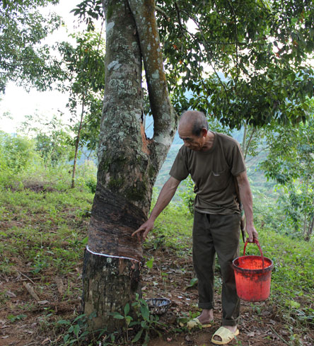 Đến nhà ông Chang A Tỏn, chúng tôi lên đồi cây cao su xanh bạt ngàn trong cái nắng nhẹ của buổi sáng. Các dụng cụ chứa mủ trên thân cây cao su đã đầy ắp. Ông đến từng cây, trút mủ vào chiếc xô lớn. Vừa đi, ông Tỏn vừa nói: “Mủ cao su ra nhiều lắm, nhưng bán với giá thấp, tôi xót quá. Giá như có nhà máy thu mua mủ cao su ở vùng Tây Bắc thì hay quá. Người dân không còn ngày ngày lo lắng vì bị thương lái ép giá”.
