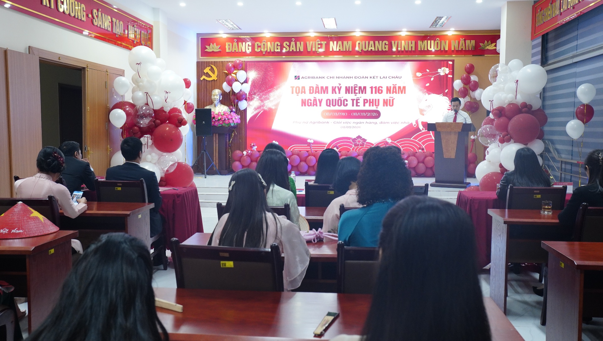 Nhân Kỷ niệm 116 năm Ngày Quốc tế Phụ nữ 8/3, Agribank Chi nhánh Đoàn Kết Lai Châu vừa tổ chức tọa đàm cho chị em phụ nữ. Dự buổi tọa đàm có đại diện lãnh đạo, đoàn viên, người lao động Agribank Chi nhánh Đoàn Kết Lai Châu.