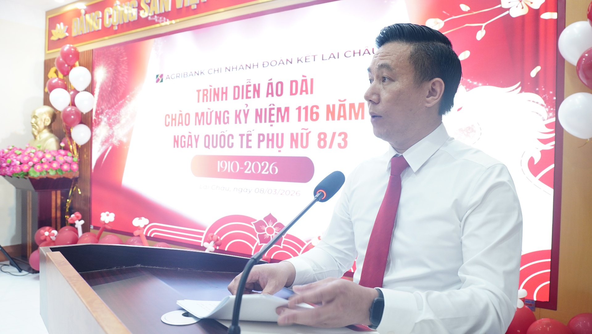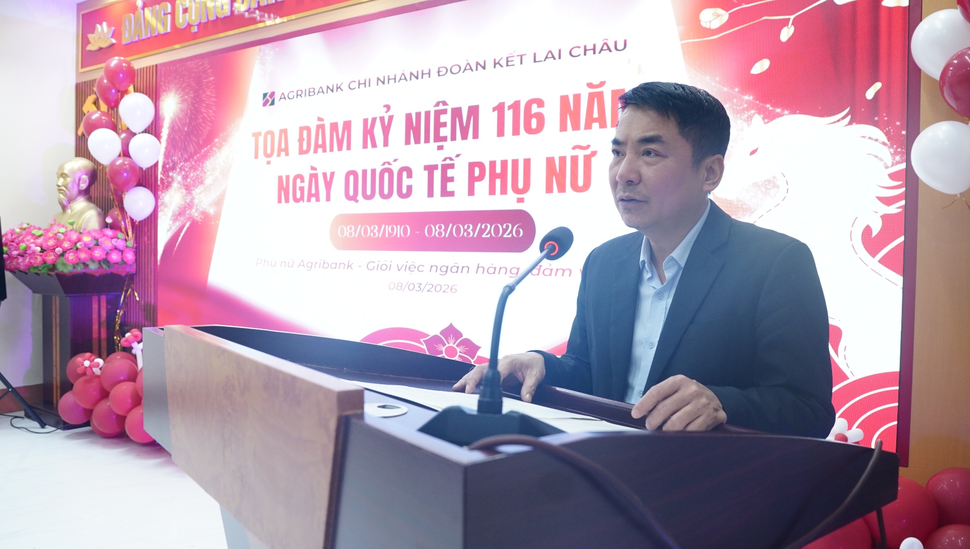 Đồng chí Trần Hữu Việt-Giám đốc Agribank Chi nhánh Đoàn Kết phát biểu chúc mừng chị em nhân Ngày Quốc tế phụ nữ 8/3.