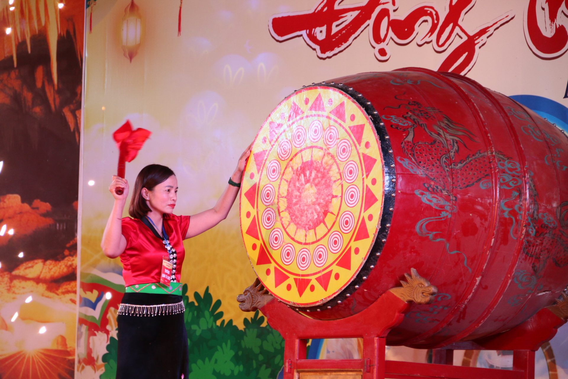 Đồng chí Nguyễn Thị Nhàn - Quyền Chủ tịch UBND xã, Trưởng Ban Tổ chức chương trình đánh trống khai hội.