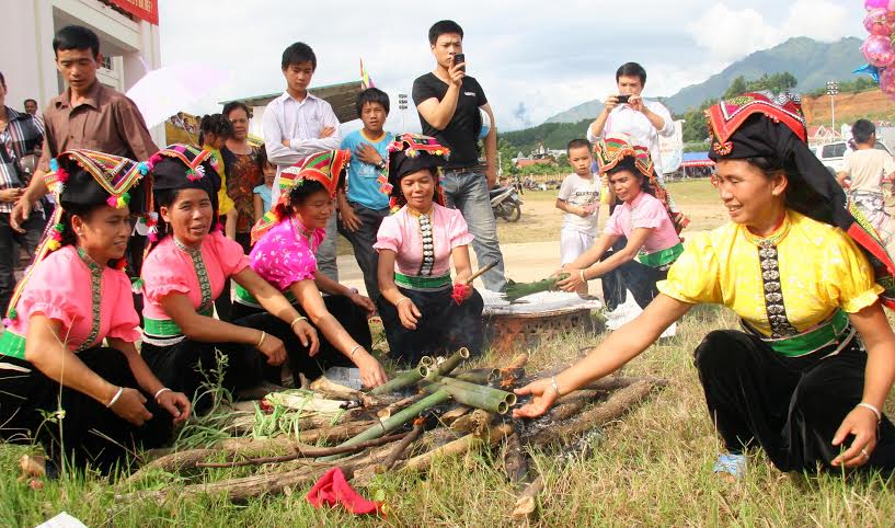 Chị Hà Thị Ha (Người đầu tiên bên phải) cùng đội xã Tà Hừa thi nấu cơm lam tại Ngày Hội văn hóa - thể thao các dân tộc huyện Than Uyên.
