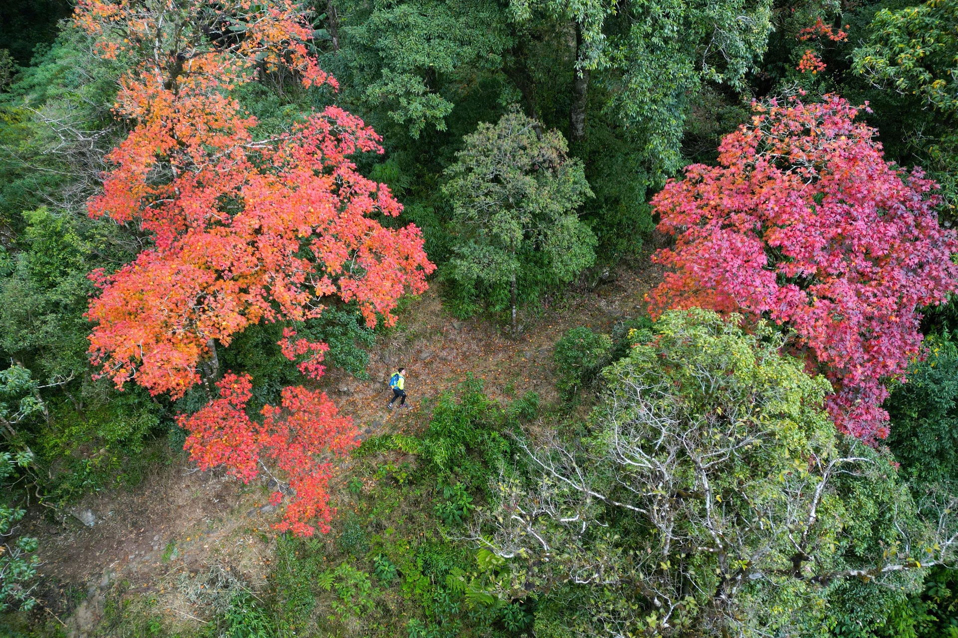 Du khách trekking qua rừng phong đang vào mùa chuyển lá trên dãy Hoàng Liên Sơn (đoạn thuộc địa phận tỉnh Lai Châu).