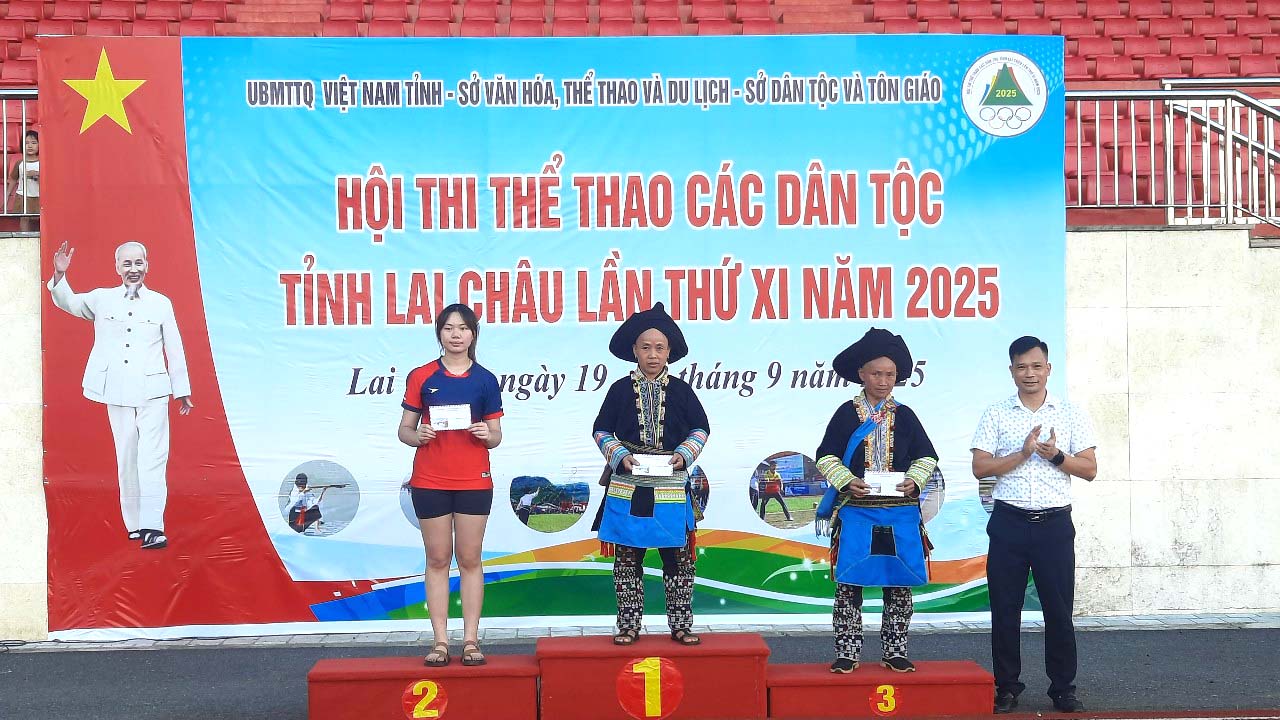 Lãnh đạo Sở Văn hóa ,Thể thao và Du lịch trao giải cho các vận động viên đạt giải môn đẩy gậy tại Hội thi Thể thao các dân tộc tỉnh Lai Châu năm 2025.
