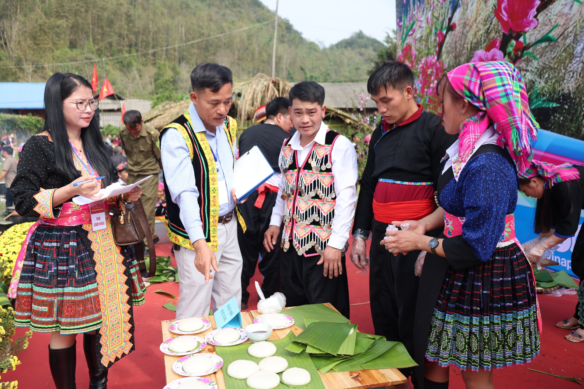 Ban Giám khảo chấm điểm cho các đội tham gia phần thi giã bánh giầy.