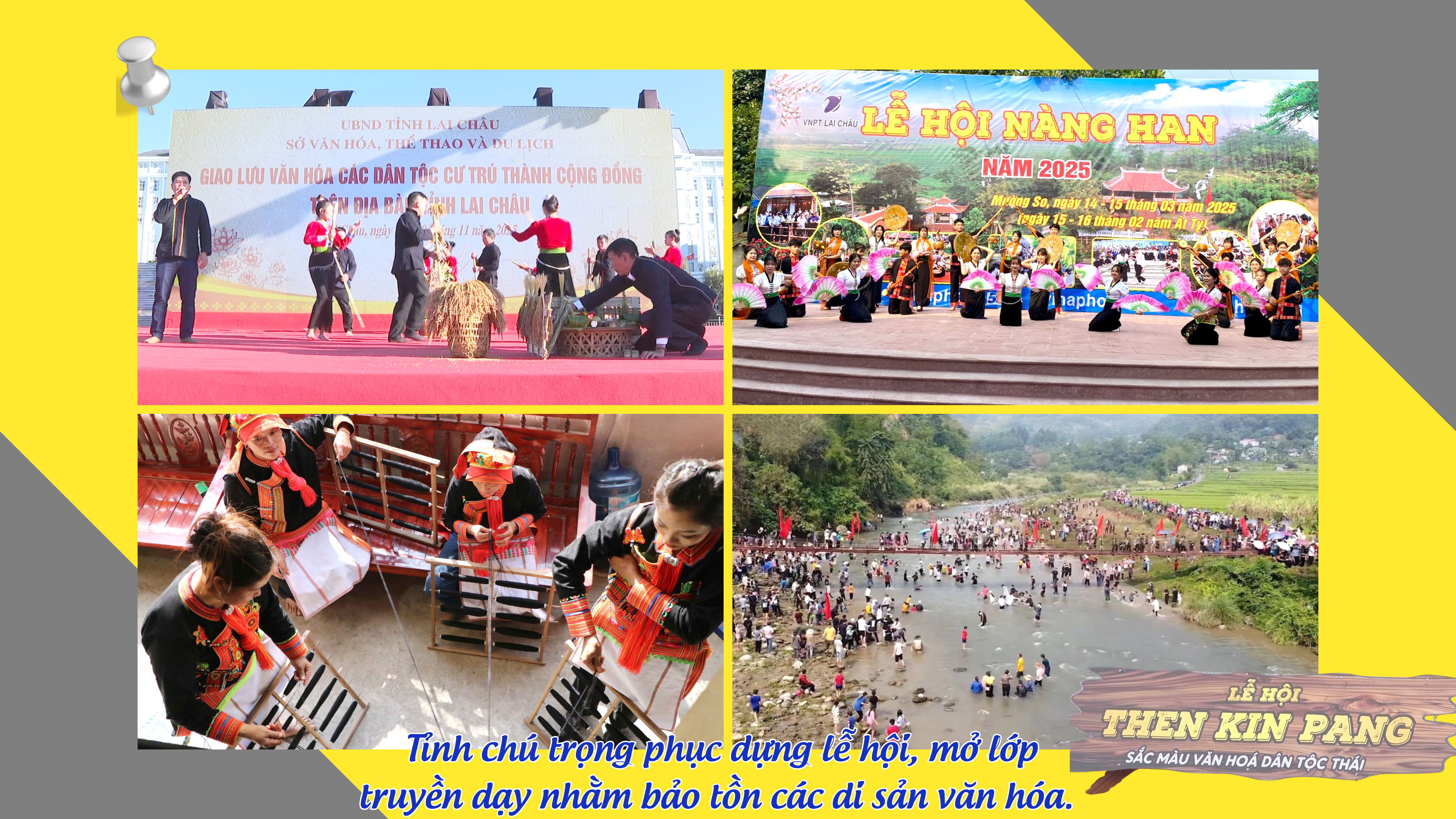 Thực hiện các nghị quyết, chương trình của Trung ương và của tỉnh, đặc biệt là Nghị quyết số 04-NQ/TU, ngày 17/02/2021 của Ban Chấp hành Đảng bộ tỉnh về bảo tồn, phát huy bản sắc văn hóa truyền thống tốt đẹp của các dân tộc gắn với phát triển du lịch giai đoạn 2021-2025, định hướng đến năm 2030, tỉnh Lai Châu đã tập trung chỉ đạo các cơ quan chuyên môn và các địa phương triển khai đồng bộ nhiều giải pháp bảo tồn di sản. Nhiều lễ hội truyền thống được phục dựng, duy trì tổ chức thường xuyên; các nghi lễ tín ngưỡng, loại hình nghệ thuật dân gian được bảo tồn đúng với phong tục, tập quán và không gian văn hoá của từng dân tộc.