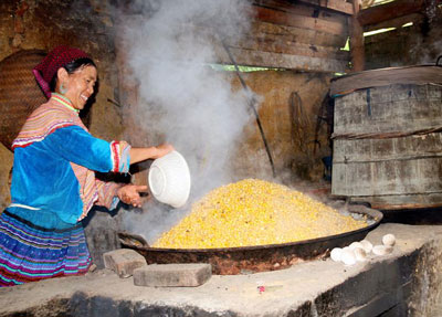 Chị Ly Seo Chùa chuẩn bị ngô chưng cất mẻ rượu mới.