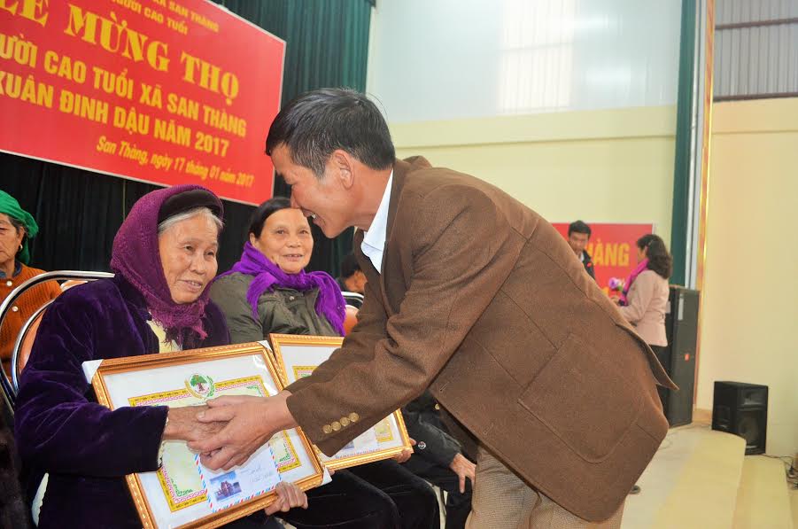 Đại diện lãnh đạo xã San Thàng trao giấy mừng thọ, quà cho các cụ cao niên trong xã.