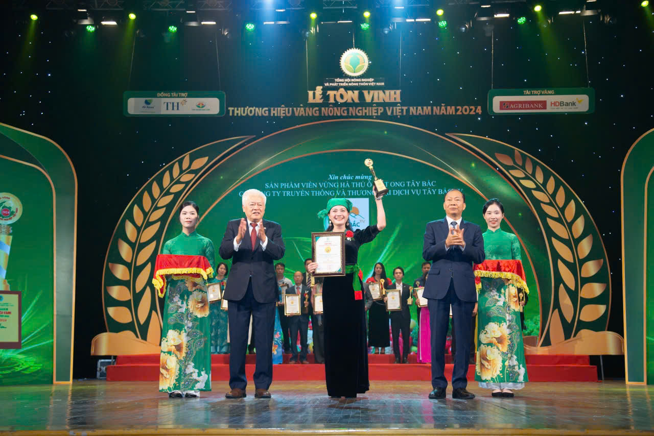 Viên Hà thủ ô mật ong vừng của Tây Bắc TV được chứng nhận "Thương hiệu Vàng nông nghiệp Việt Nam năm 2024". Trong ảnh: Chị Khà Thị Hạnh - Phó Chủ tịch HĐQT Tây Bắc TV nhận chứng nhận Thương hiệu Vàng nông nghiệp Việt Nam năm 2024 tại buổi lễ.
