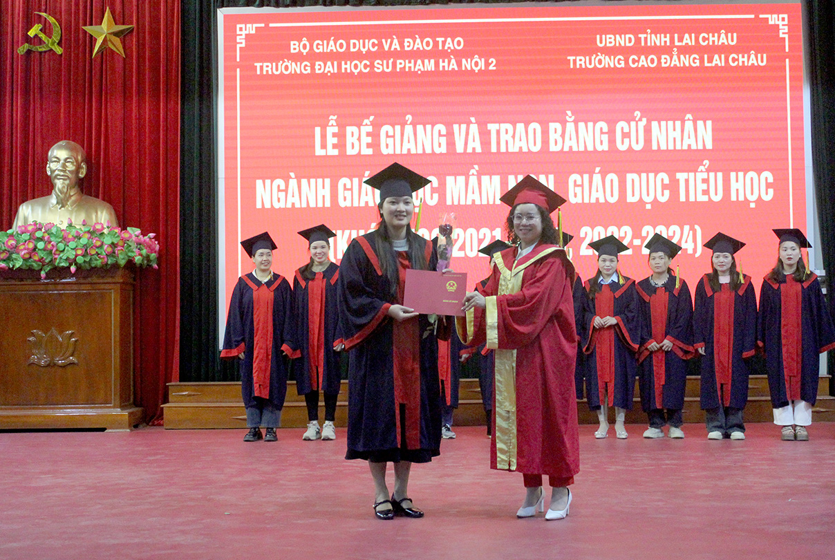 Tại lễ bế giảng, đại diện Trường Đại học Sư phạm Hà Nội 2, Trường Cao đẳng Lai Châu trao bằng tốt nghiệp cho các học viên.
