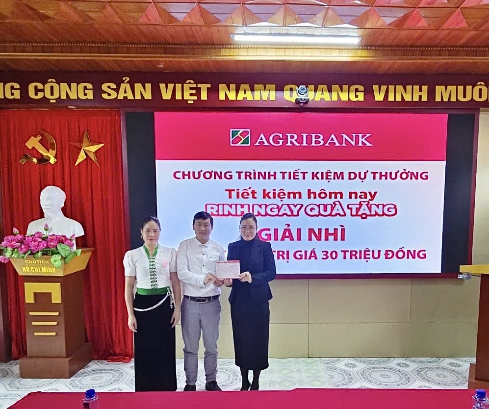 Lãnh đạo Agribank - Chi nhánh Than Uyên trao giải Nhì (sổ tiết kiệm trị giá 30 triệu đồng) cho gia đình anh Lò Văn Đoan - bản Khoen On, xã Khoen On, tỉnh Lai Châu.