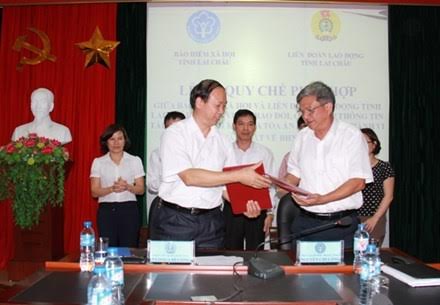 Đại diện lãnh đạo LĐLĐ tỉnh Lai Châu - BHXH tỉnh ký Quy chế phối hợp trao đổi, cung cấp thông tin, tài liệu trong việc khởi kiện ra tòa án đối với các hành vi vi phạm pháp luật về BHXH, BHYT, BHTN giai đoạn 2016 – 2020.