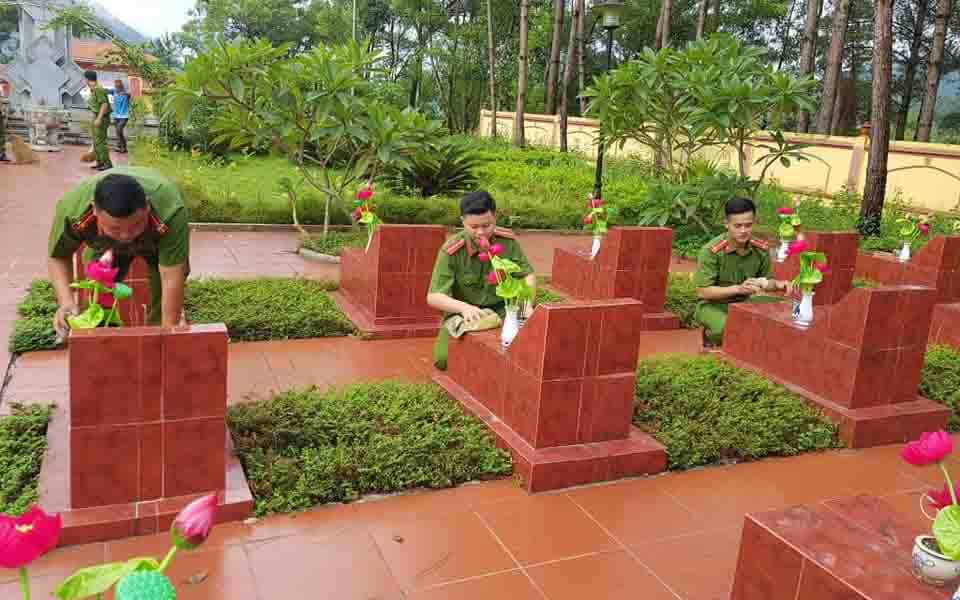 Đoàn viên, thanh niên Đoàn cơ sở Công an huyện Than Uyên vệ sinh Nghĩa trang Liệt sỹ huyện.