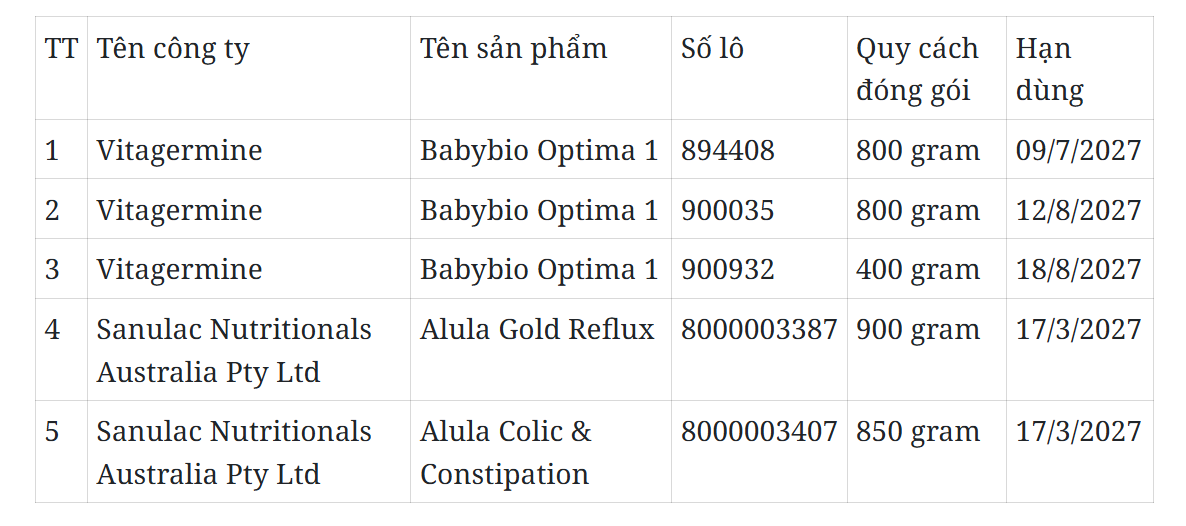 Theo Cục An toàn thực phẩm, qua công tác hậu kiểm về thực hiện quy định đăng ký bản công bố và tự công bố, sản xuất, kinh doanh thực phẩm, Cục An toàn thực phẩm phát hiện các sản phẩm thực phẩm công thức Babybio Optima 1 do công ty Vitagermine sản xuất và sản phẩm thực phẩm công thức Alula Colic & Constipation do công ty Sanulac Nutritionals Australia Pty Ltd sản xuất đang được quảng cáo và kinh doanh trên nền tảng xã hội (tiktok) tại địa chỉ https://www.tiktok.com/@pp.store8888/video/7574253758507502866?q=Baby%20bio%20optima%201&t=1769494767179.https://www.tiktok.com/@georgiar10/video/7598359156977929479?q=Alula%20Colic%20%26%20Constipation&t=1769494992780