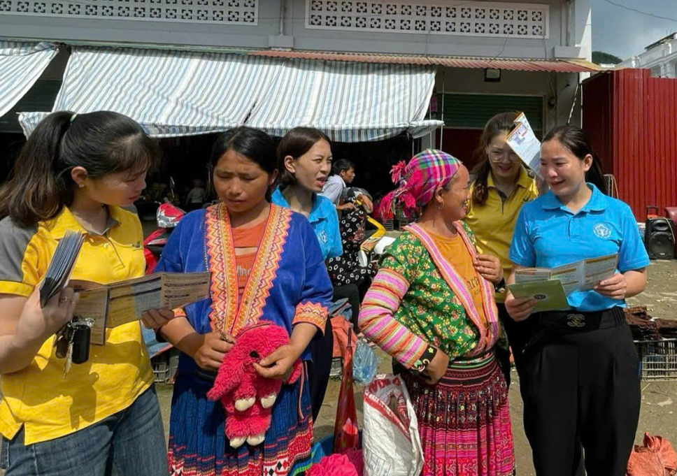 Chị Cao Thị Tâm cùng cán bộ Bảo hiểm xã hội cơ sở Sìn Hồ tuyên truyền chính sách bảo hiểm xã hội, bảo hiểm y tế đến người dân.