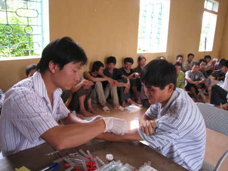 Cán bộ Trung tâm Phòng chống HIV/AIDS lấy mẫu máu xét nghiệm.