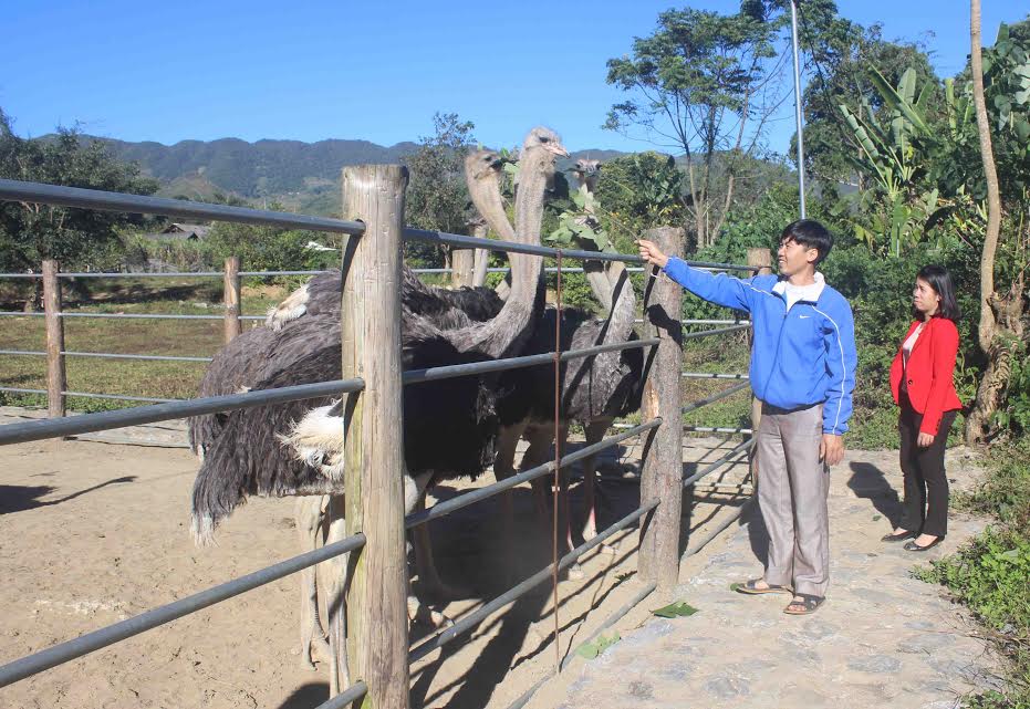 Khách du lịch thăm khu nuôi đà điểu ở bản Gia Khâu 1 (xã Nậm Loỏng).