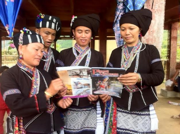 Hội viên phụ nữ xã Bản Hon tìm hiểu thông tin qua sách báo.