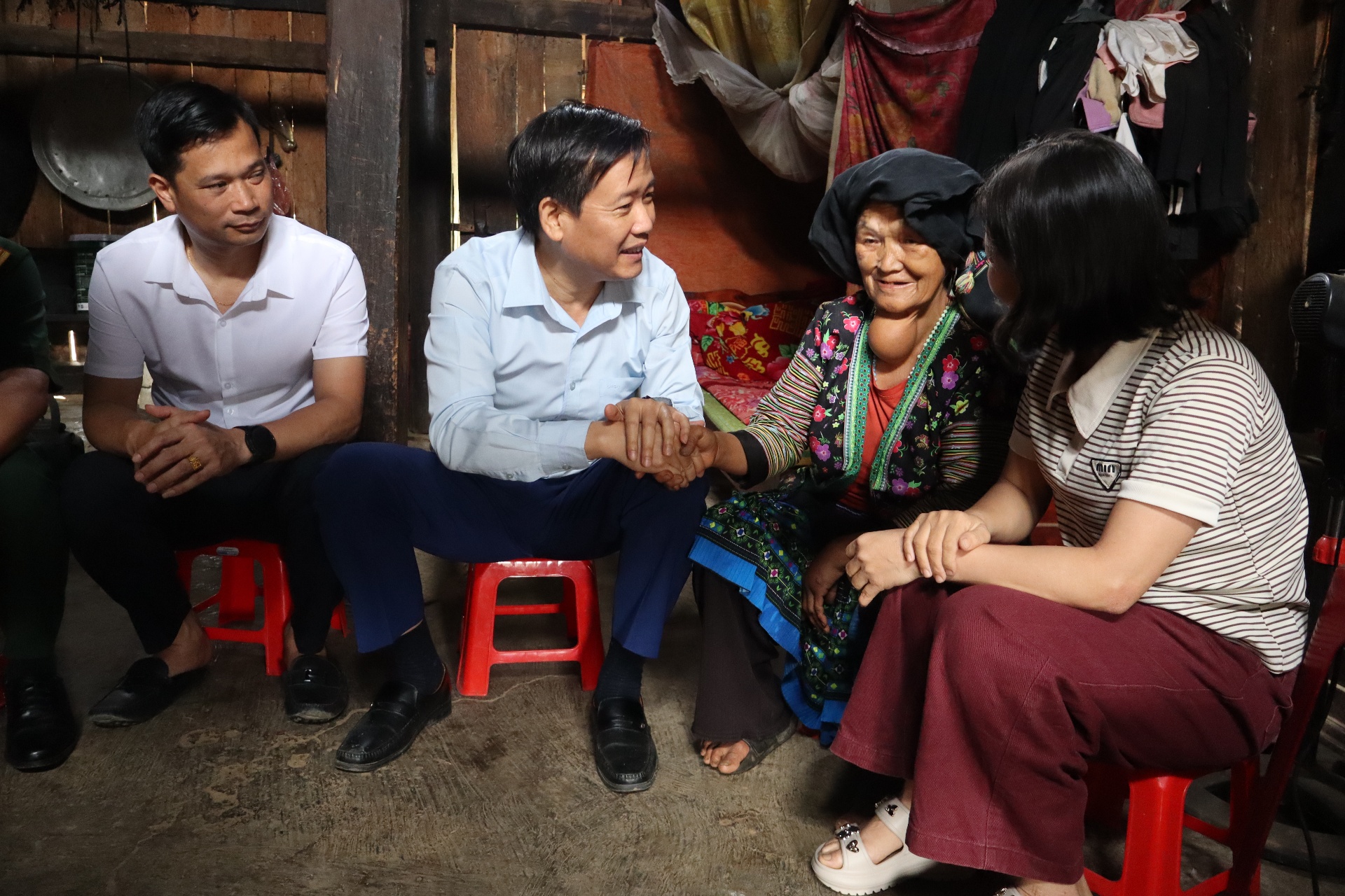 Đồng chí Lê Đức Dục - Ủy viên Ban Thường vụ, Trưởng Ban TG&DV Tỉnh ủy hỏi thăm, động viên bà Lù Thị Bâu ở bản Khâu Riềng.